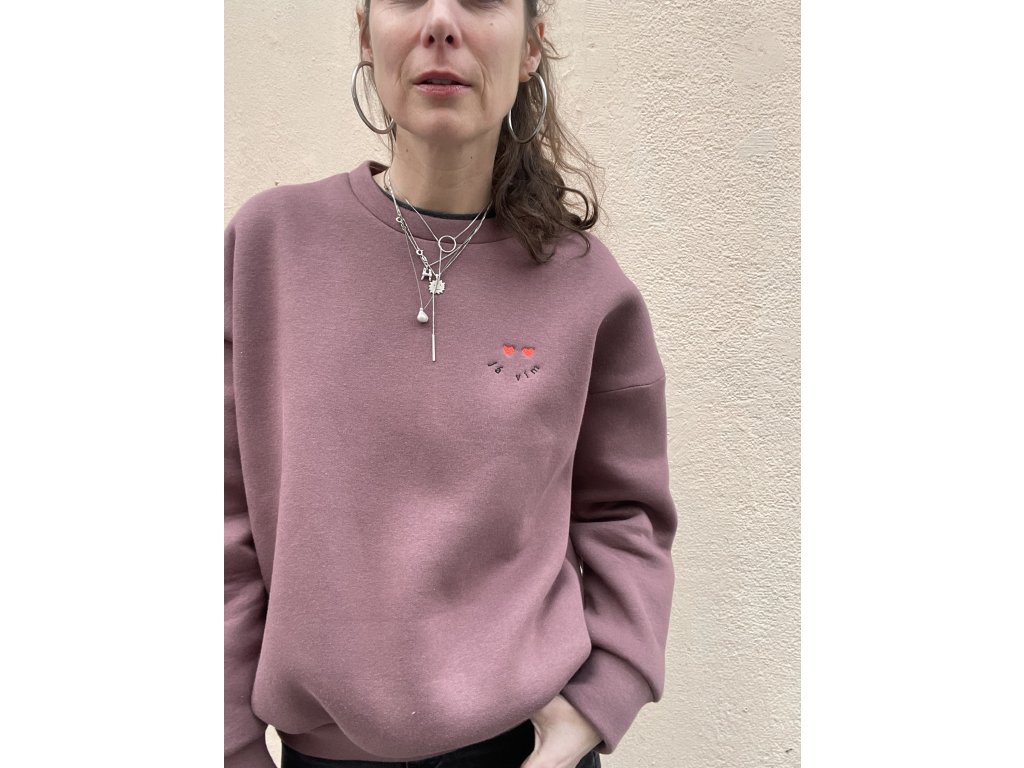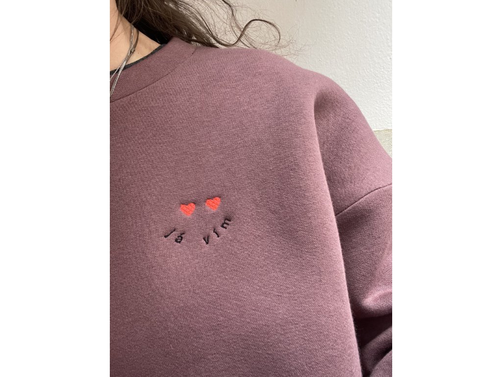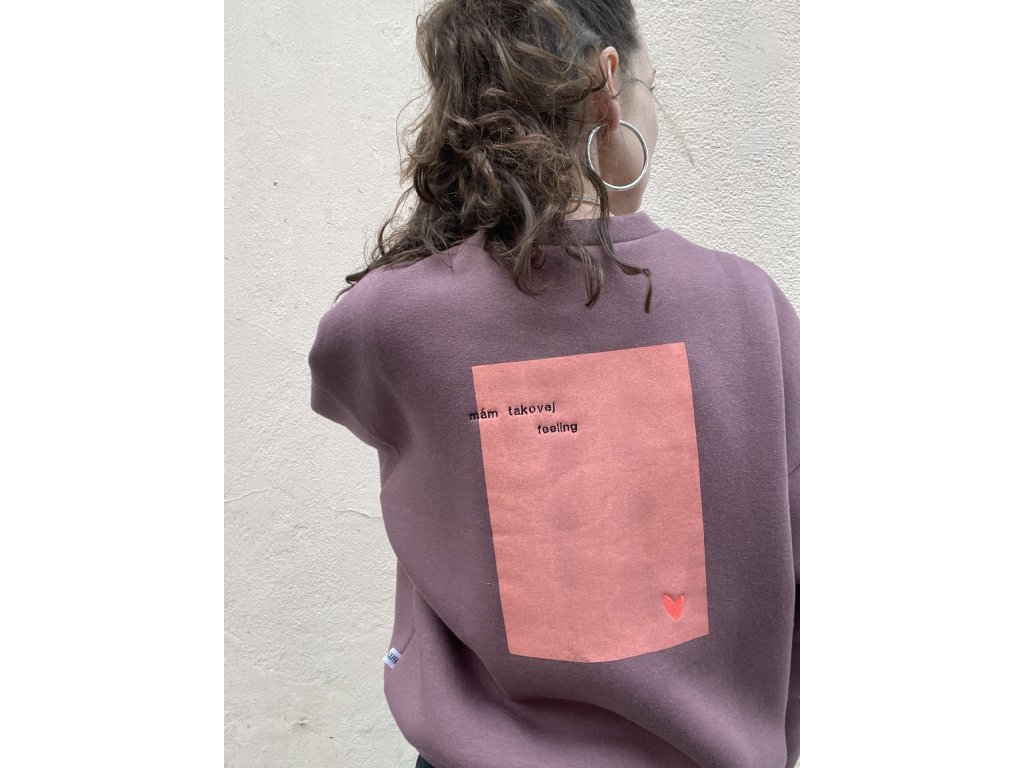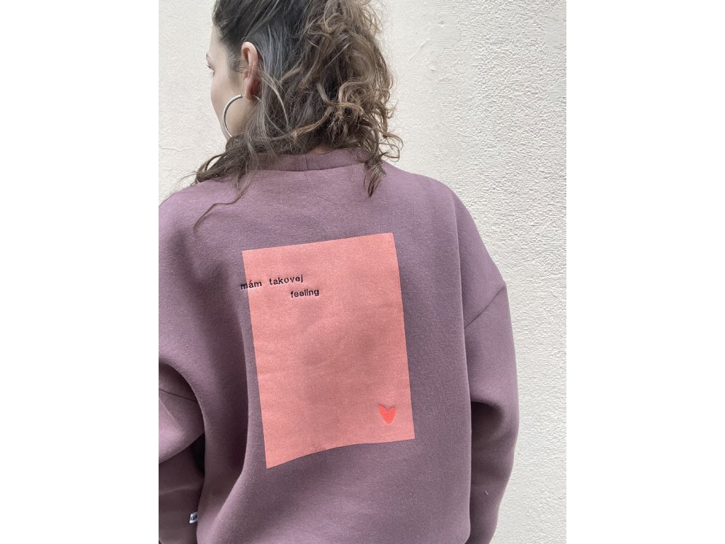 Mikina je z extra silné teplákoviny, vínovo/hnědé barvy, má oversize střih, výšivku na prsu “ já vím “ a dvě srdce, na zádech tisk a výšivku “mám takovej feeling “ a srdce