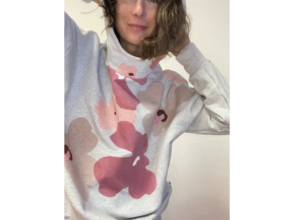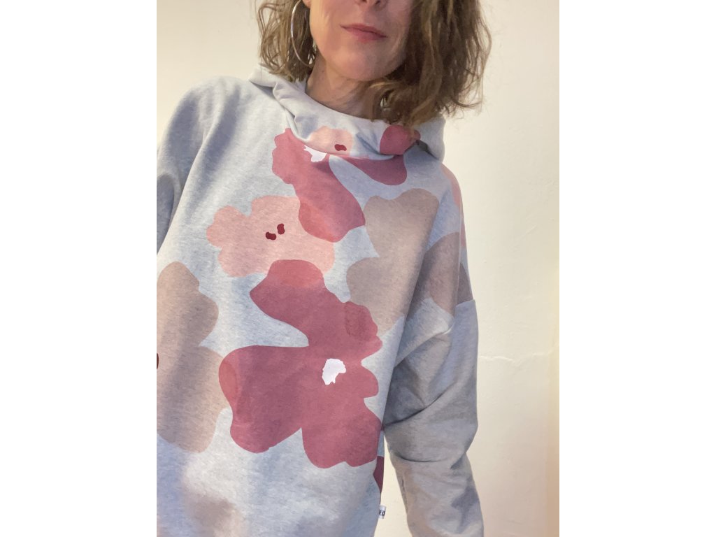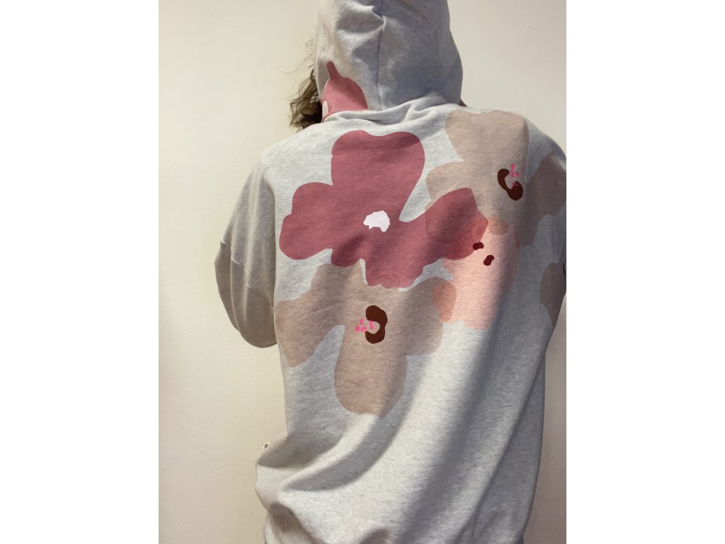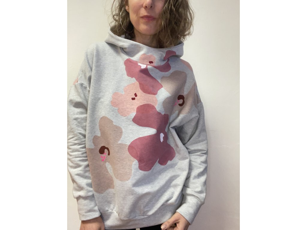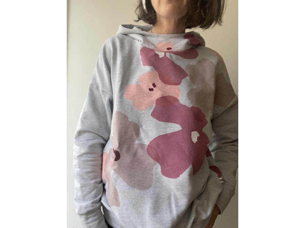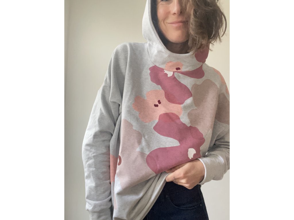 Mikina je ze zateplené teplákoviny šedé barvy, má volný oversize střih a barevný potisk, dvojitá kapuca.