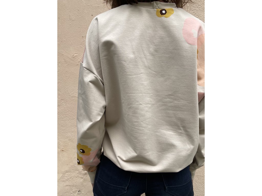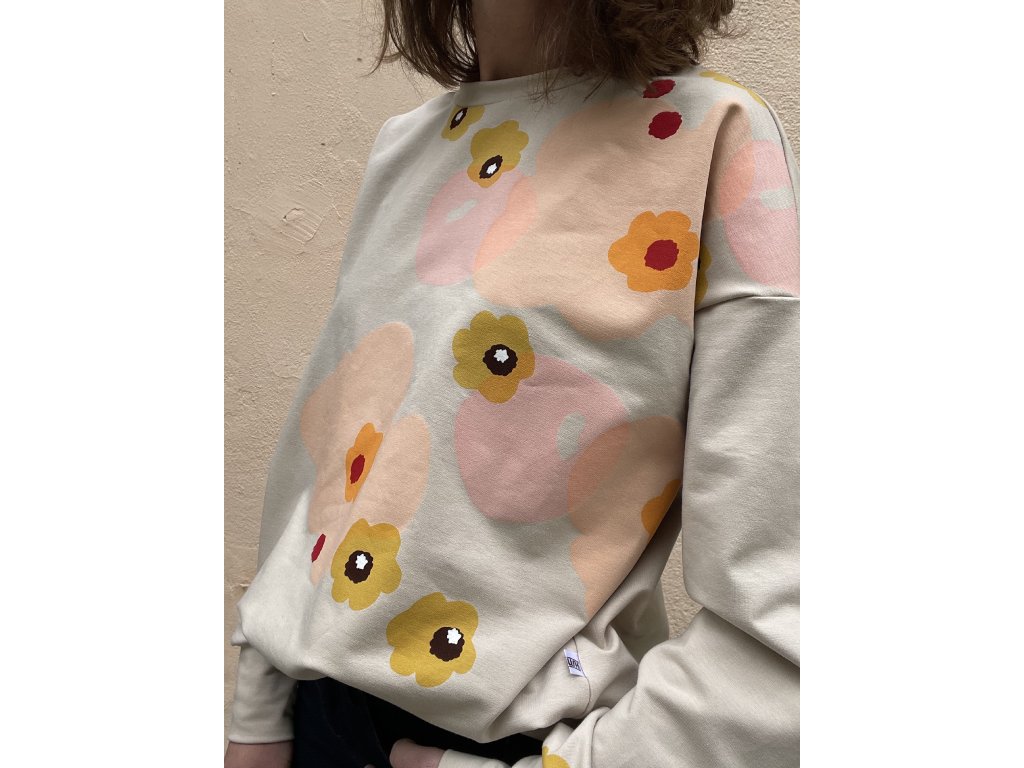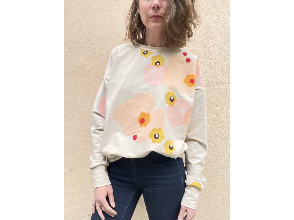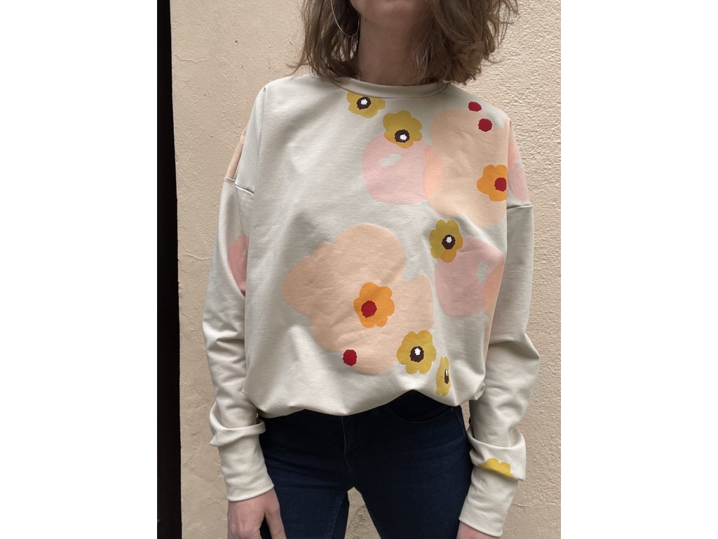 Mikina je z pružné, tenké teplákoviny, má volný oversize střih, barevný potisk.
