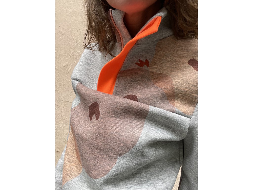 Mikina je ze sv.šedé zateplené teplákoviny, má potisk i drobnou výšivku, krátký zip do stojáčku schovaný pod výraznou oranž patkou.