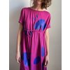 Růžové šaty Abstrakt, jsou z pružné viskozy, mají volný střih, který díky vázání pod prsy skrze dirky umožňuje nastavit velikost podle potřeby. Jasně modrý potisk.Nezačištěný dolní kraj, ohrnuté a bodově prošité rukávky.