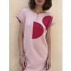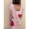 Šaty jsou ze sv.růžové pružné a tenké teplákoviny, mají volný střih, ohrnuté a bodově prošité rukávky, výstřih na zádech s červenou gumou.Červeno/černý tisk.