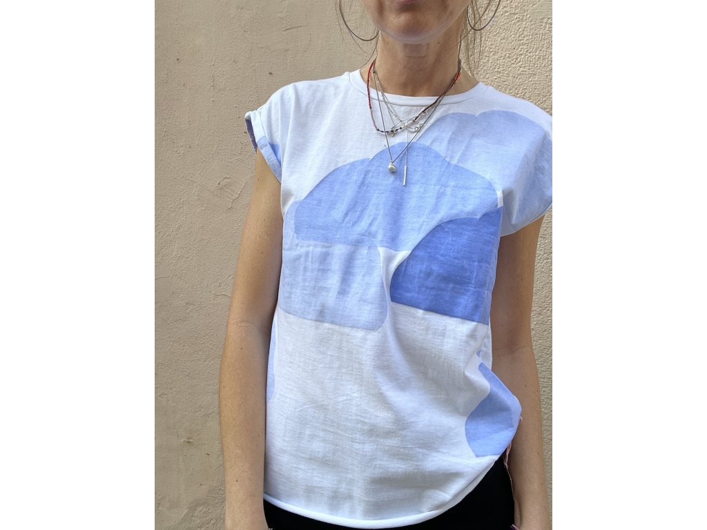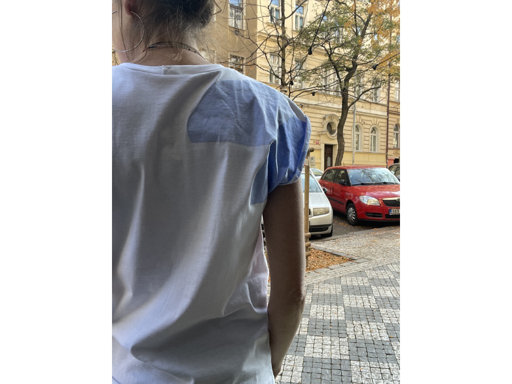 Triko je z bavlněného úpletu, má přinechané ohrnuté rukávky, potisk odstínovaných mraků, nezačištěný dolní kraj