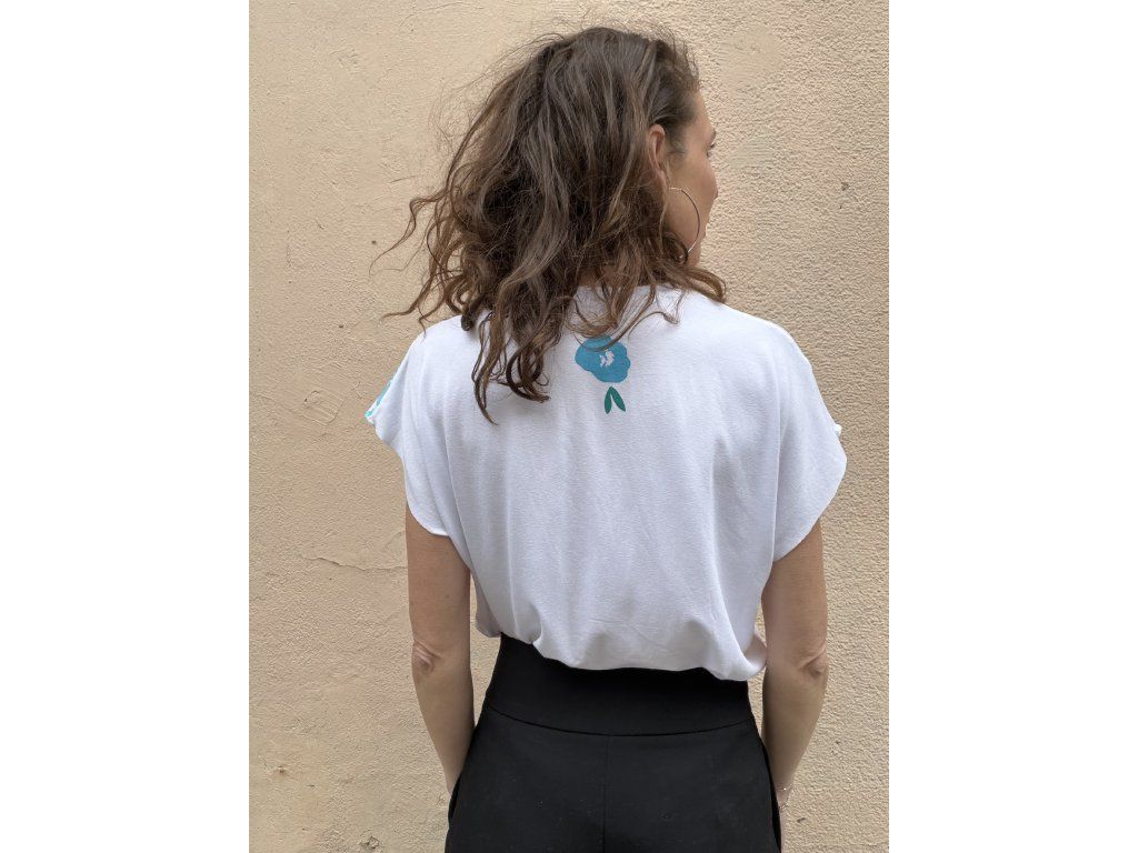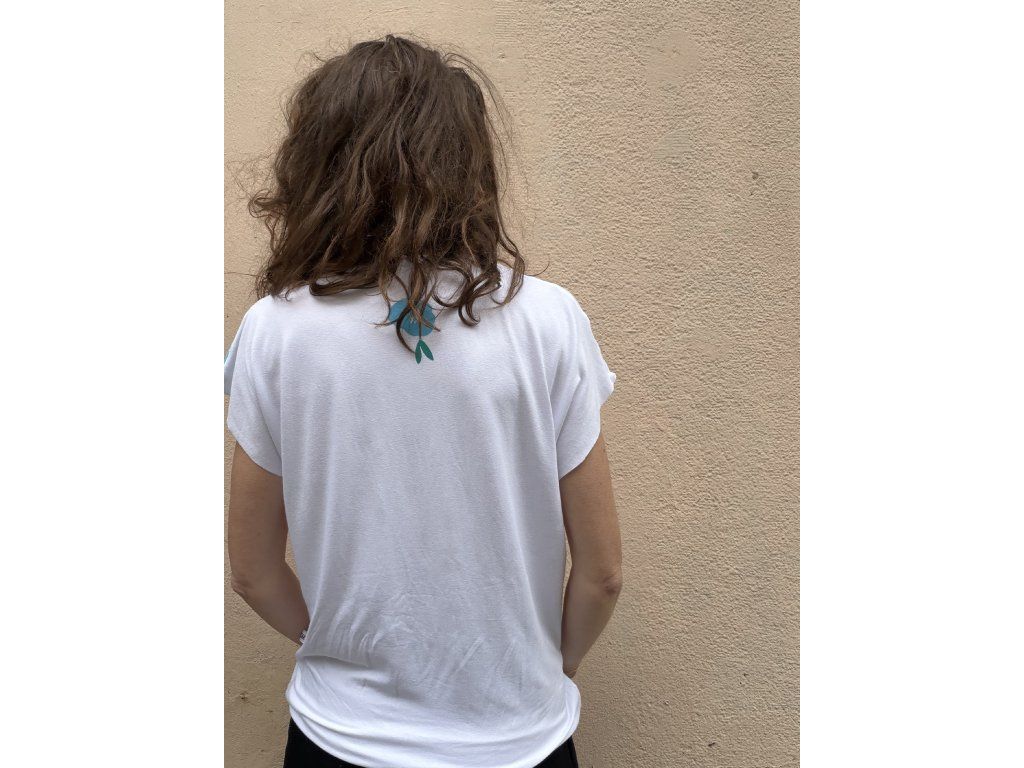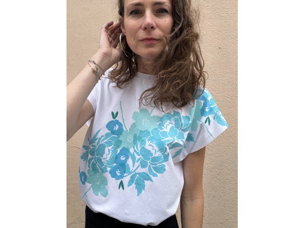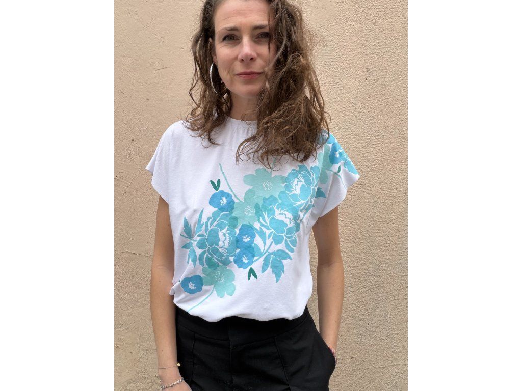 Triko je z bílé, pružné viskozy, má volný střih, přinechané nezačištěné rukávky i dolní kraj.Potisk v tyrkys/mint odstínech s oranžovými detaily.