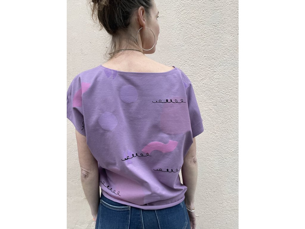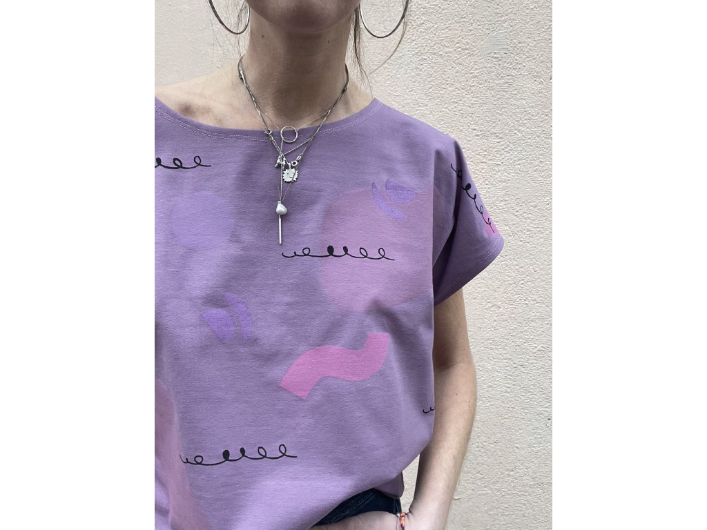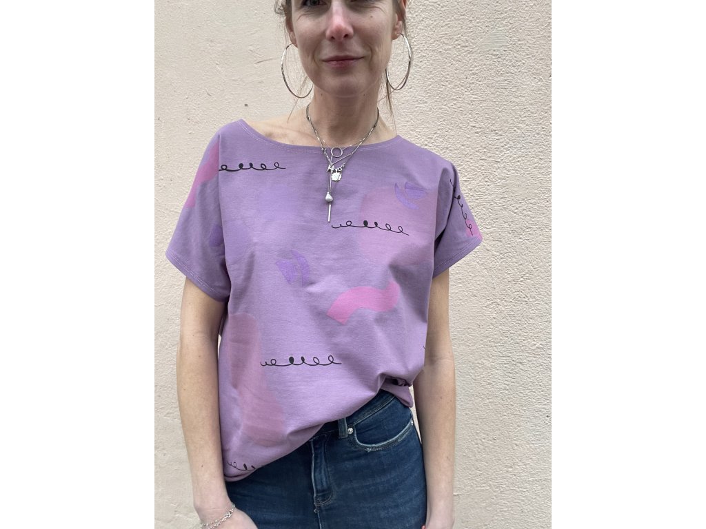 Fialkové pružné triko má volný netopýří střih, lodičkový výstřih, celoplošný jemný potisk, nezačištěný dolní kraj…