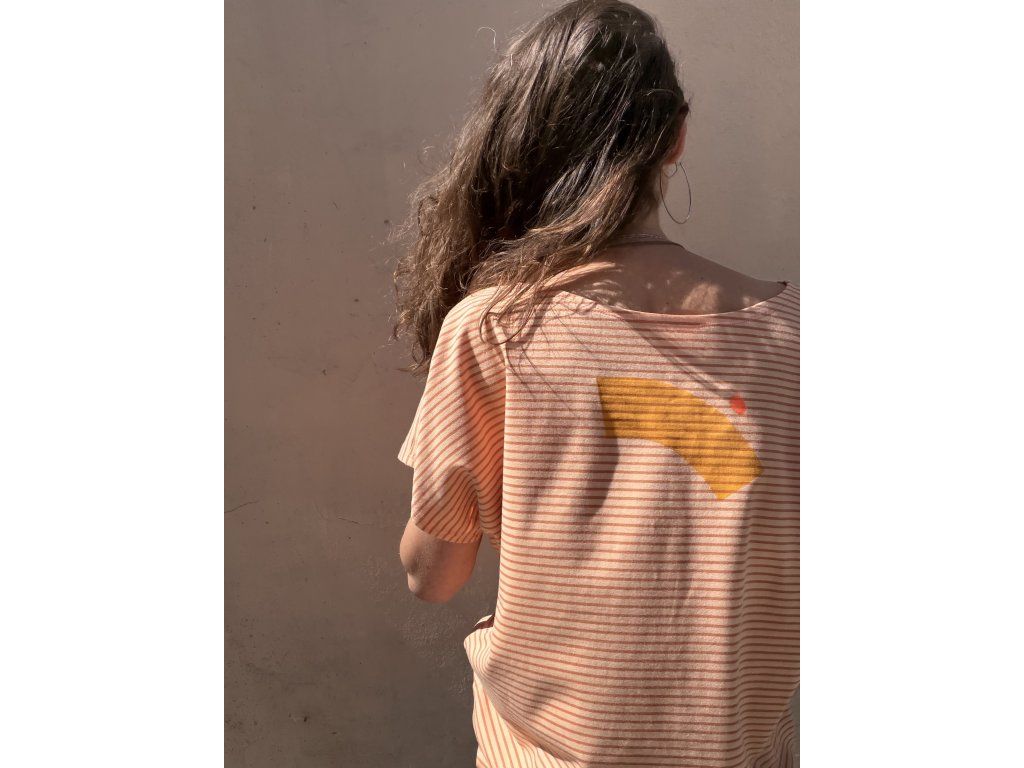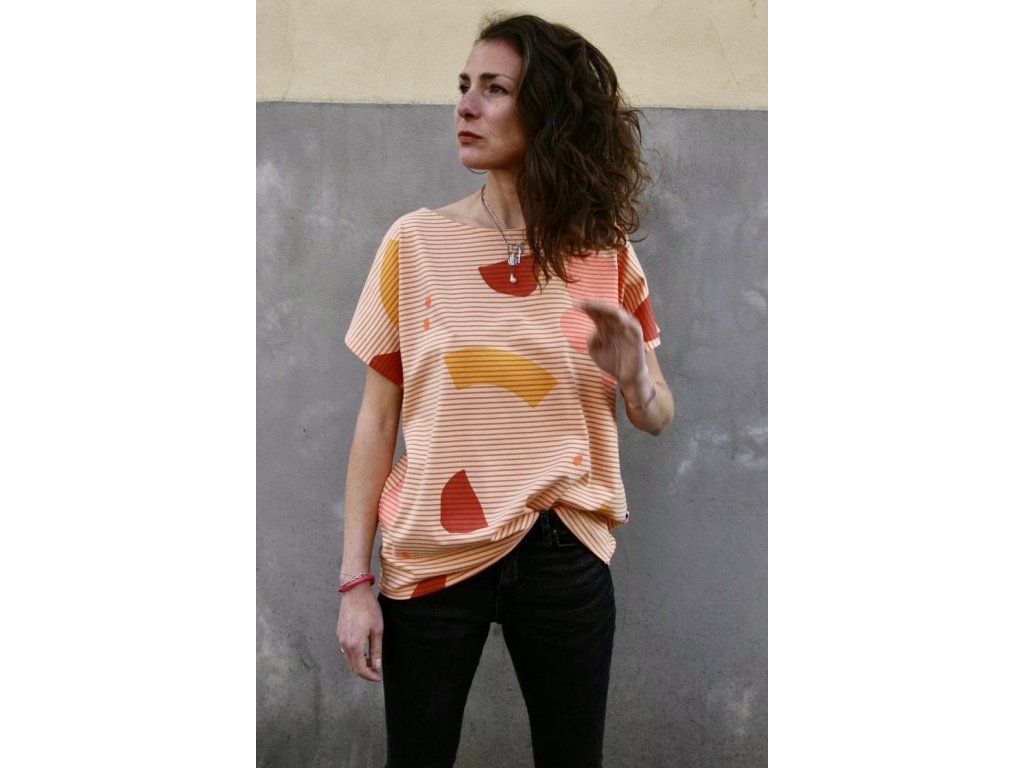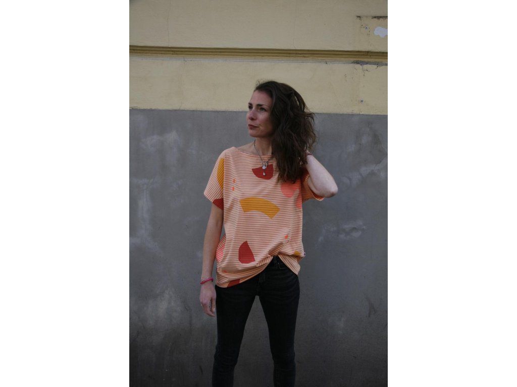 Triko je z pruhovaného okr pružného úpletu, má barevný abstrakt potisk, volný netopýří střih.