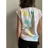 Tričko je z pružné bílé bavlny.Střih s přinechanými a ohrnutými rukávky, nezačištěný dolní kraj.Jemný pastelový potisk.