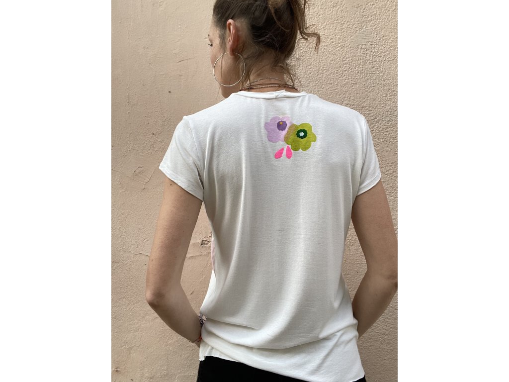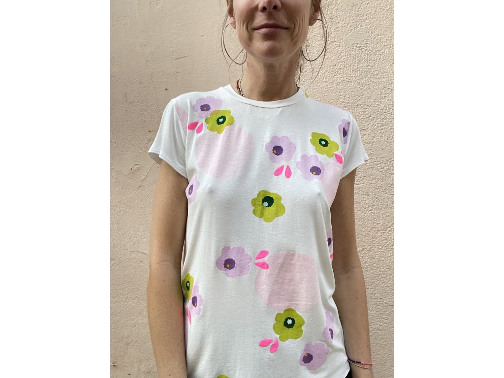 Triko je z pružného, lehkého úpletu, má klasický střih, nezačištěný dolní kraj, barevný motiv kytek