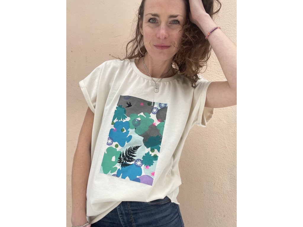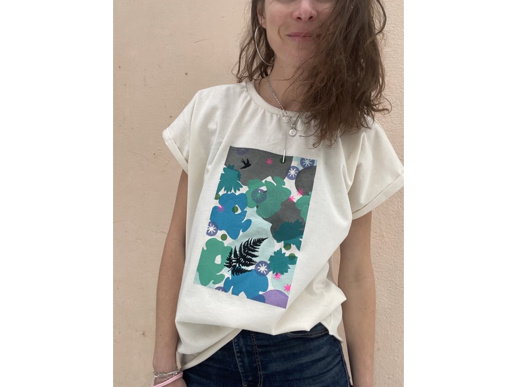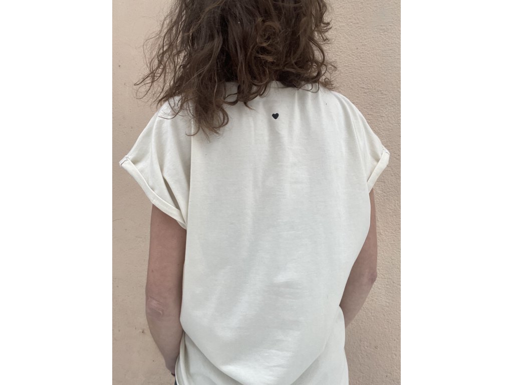 Triko je z bio natur bavlny, má volný střih, ohrnuté a bodově prošité rukávky, nezačištěný dolní kraj, barevný tisk s černou výšivkou na předním díle, mini černé vyšité srdce na zadním díle.