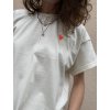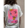 Triko je z natur bio bavlny, má volný oversize střih, ohrnuté a prošité rukávky a nezačištěný dolní kraj. Na zádech neon tisk plus černá výšivka, na prsu pink výšivka.