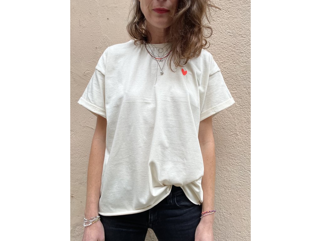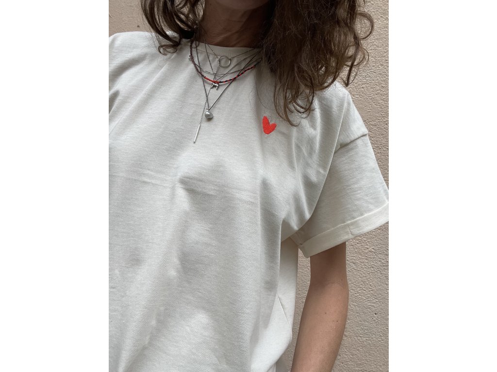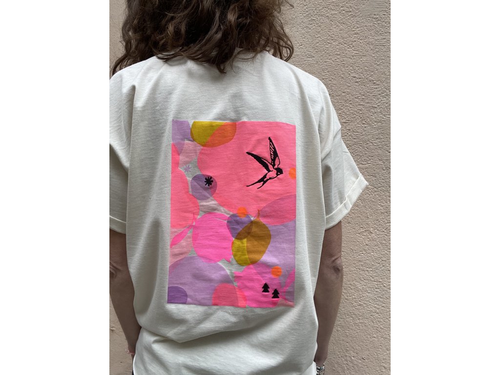 Triko je z natur bio bavlny, má volný oversize střih, ohrnuté a prošité rukávky a nezačištěný dolní kraj. Na zádech neon tisk plus černá výšivka, na prsu pink výšivka.