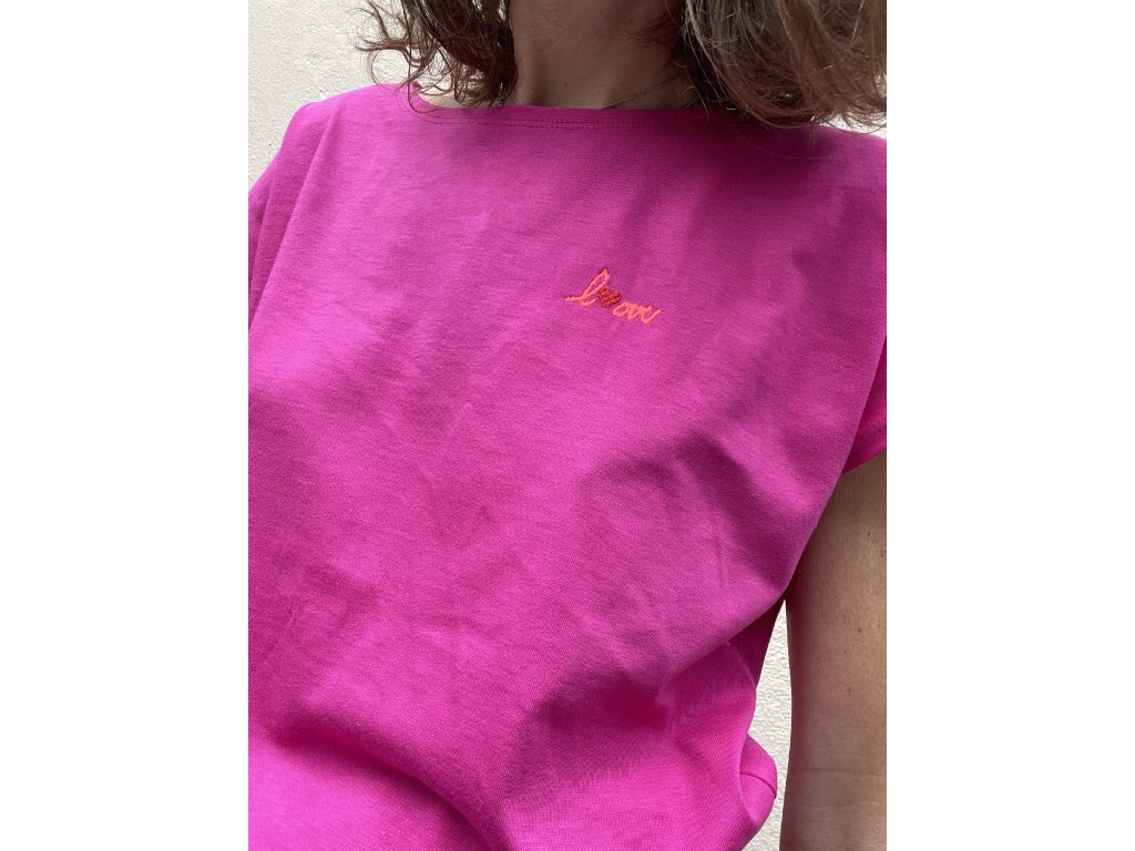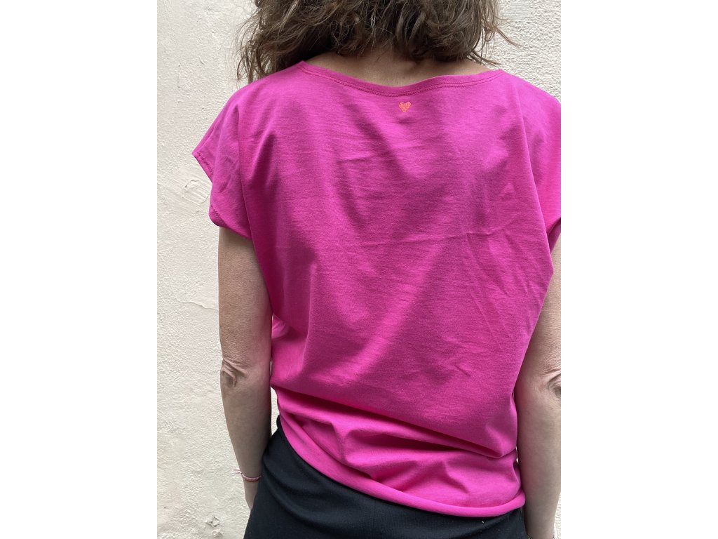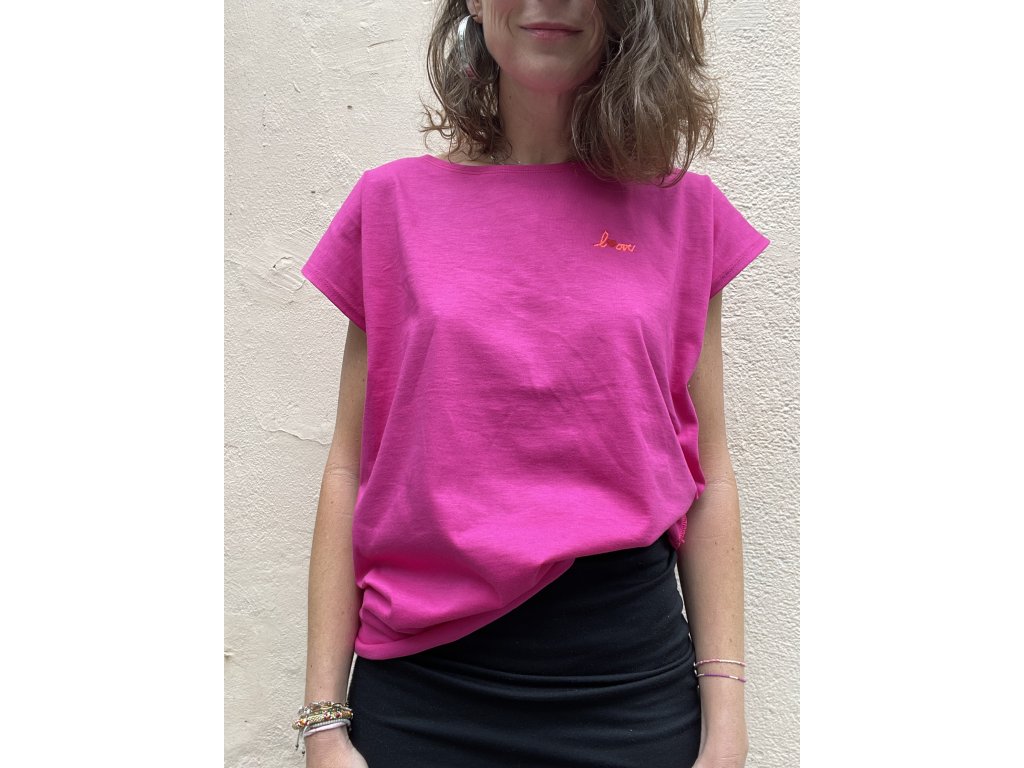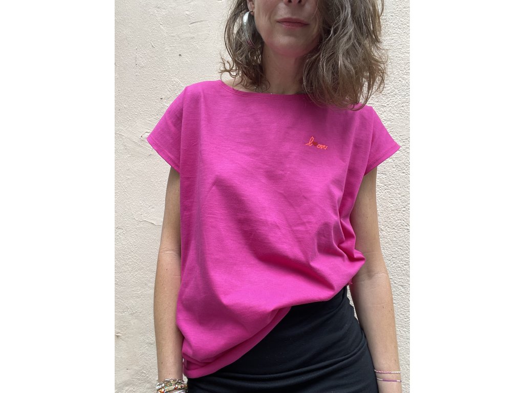 Triko je z růžové bavlny. Má volný střih, lodičkový výstřih, nezačištěný dolní kraj, jasně růžová a červená výšivka.