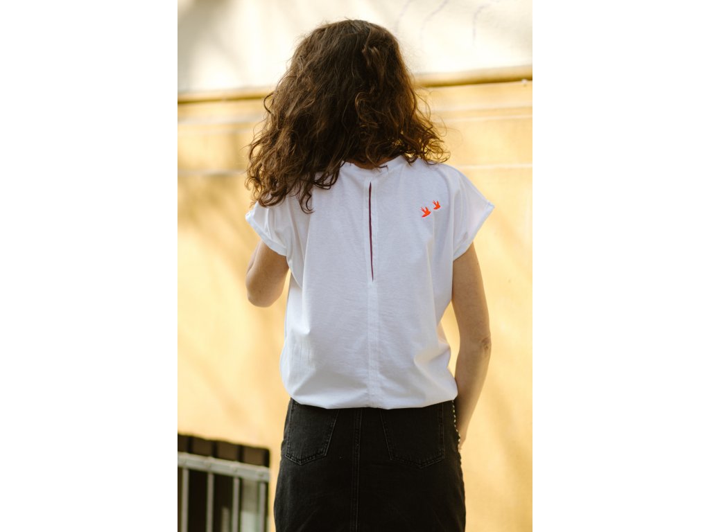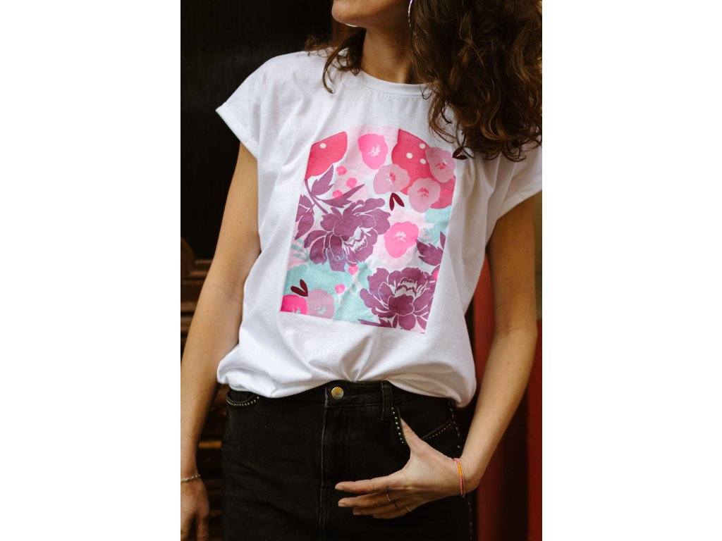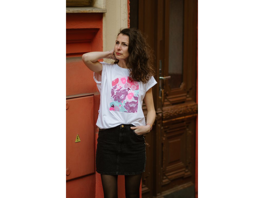 Triko je z bavlněného úpletu, má volný střih s ohrnutými a bodově prošitými rukávky, barevný tisk na předním díle, na zadním díle rozparek středě a pink výšivka, triko je staženo do lemu.