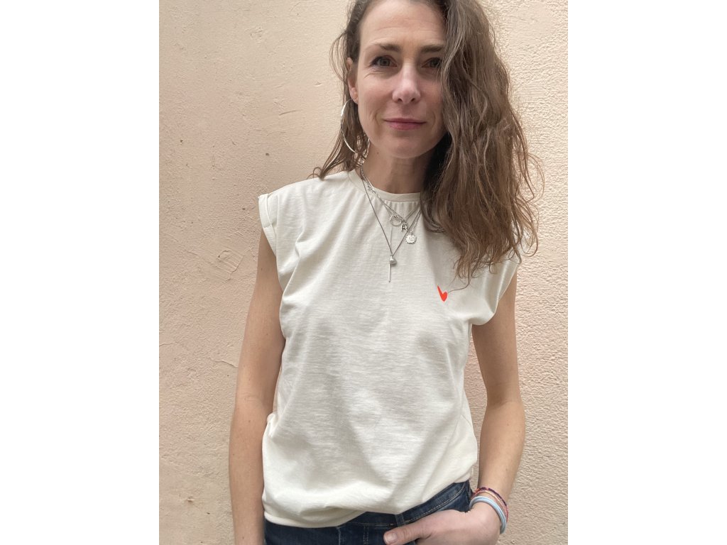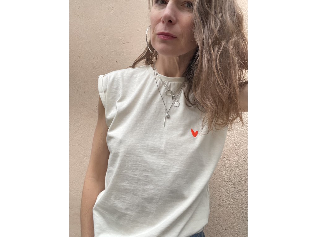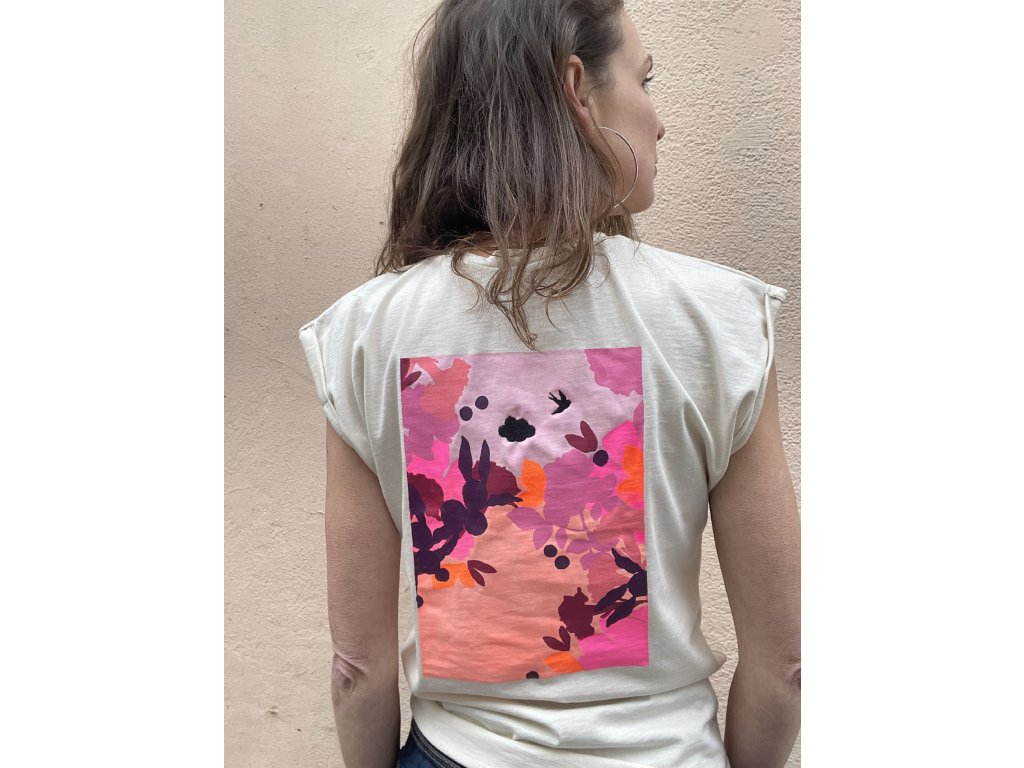 Triko je z bio natur bavlny, má ohrnuté a bodově prošité rukávky, nezačištěný dolní kraj, výšivka pink srdce na předním díle, barevný tisk s výšivkou na zádech.
