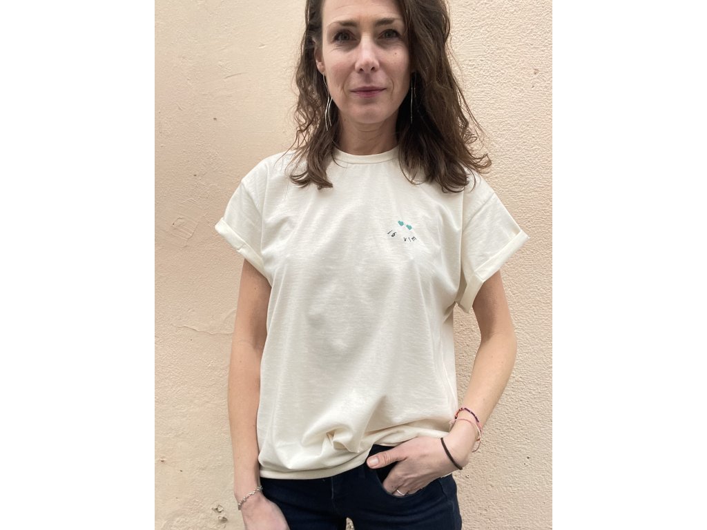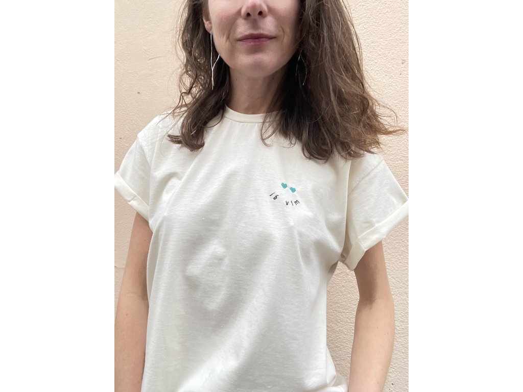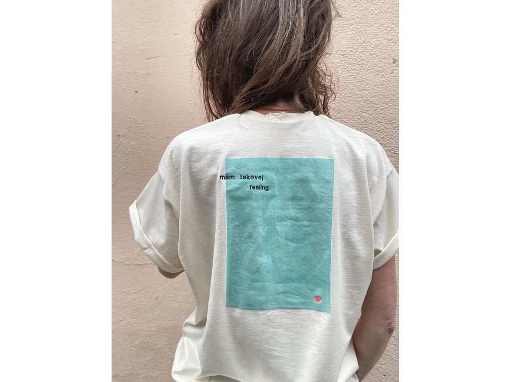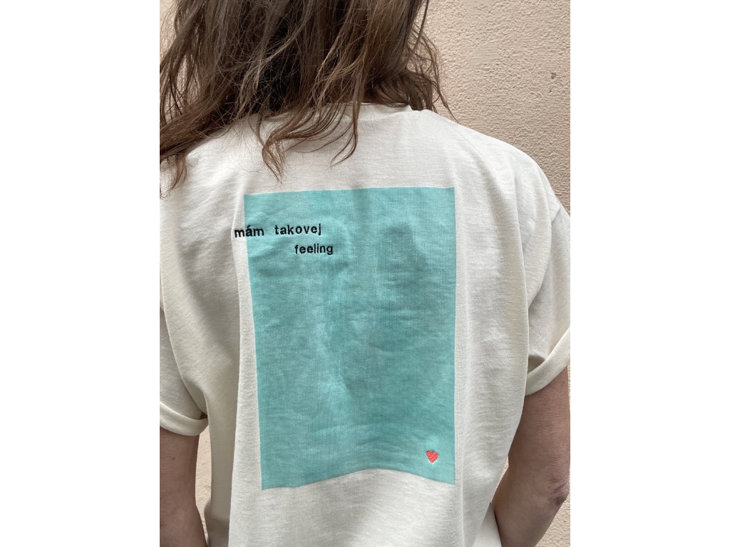 Triko je z natur bio bavlny, má volný oversize střih,, nezačištěný dolní kraj, na prsu vyšitý nápis “já vím “ a dvě srdce, na zadním díle v obdelníku vyšito srdce a nápis “ mám takovej feeling “