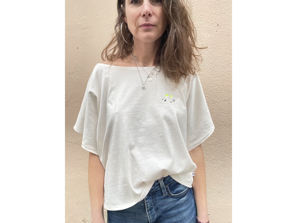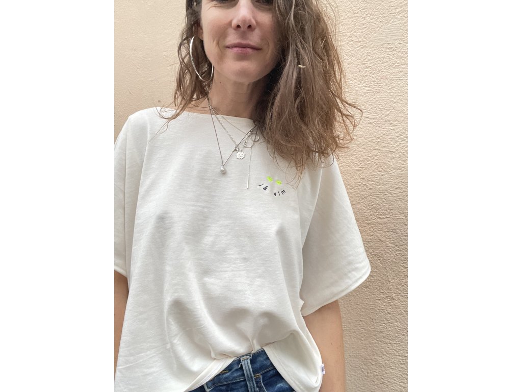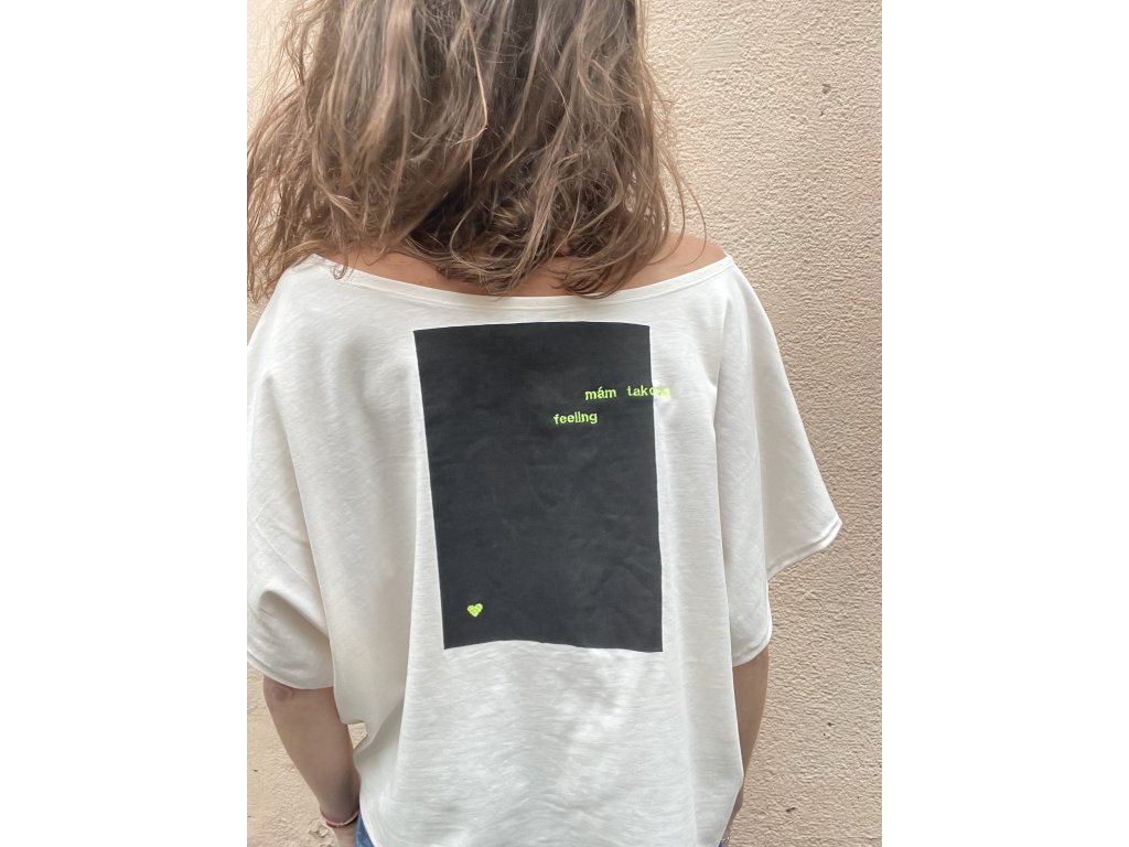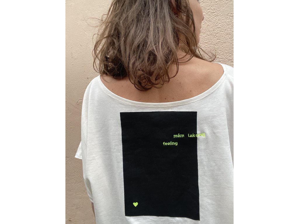 Triko je z krémové bavlny, má oversize volný střih, délku do vyšího pasu, velký lodičkový výstřih, černo- neonovou výšivku na prsu, černý tisk a neonovou výšivku na zádech.