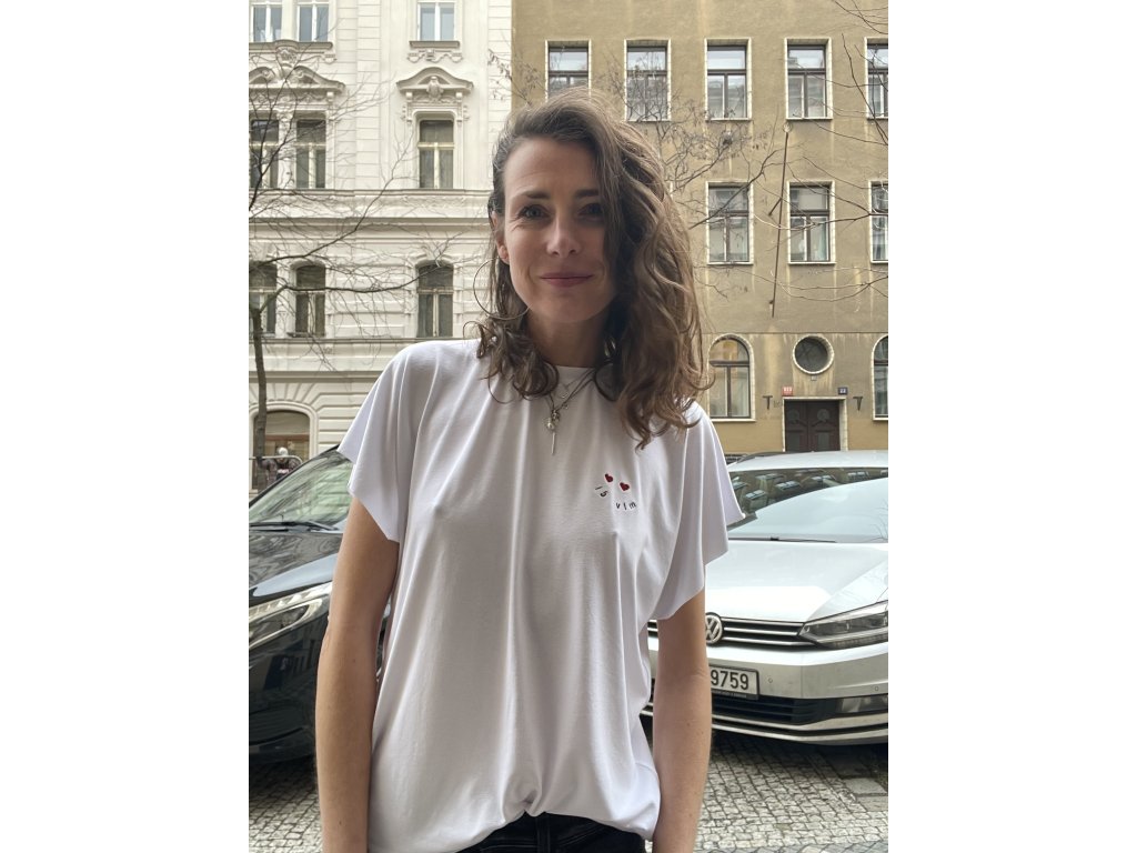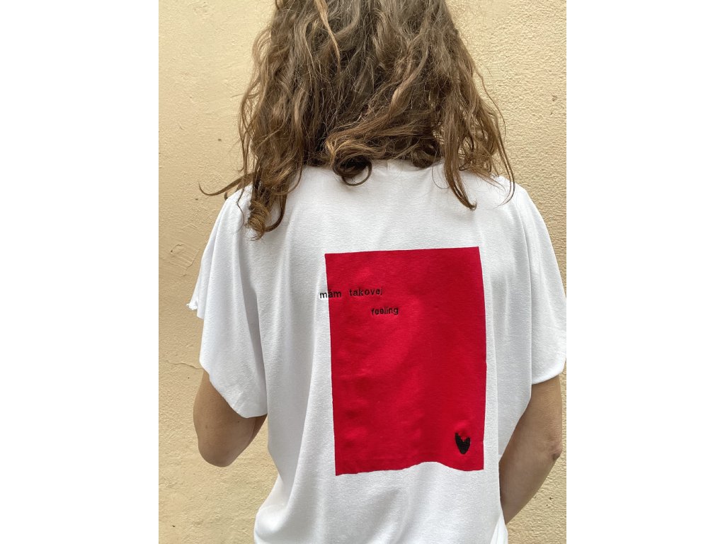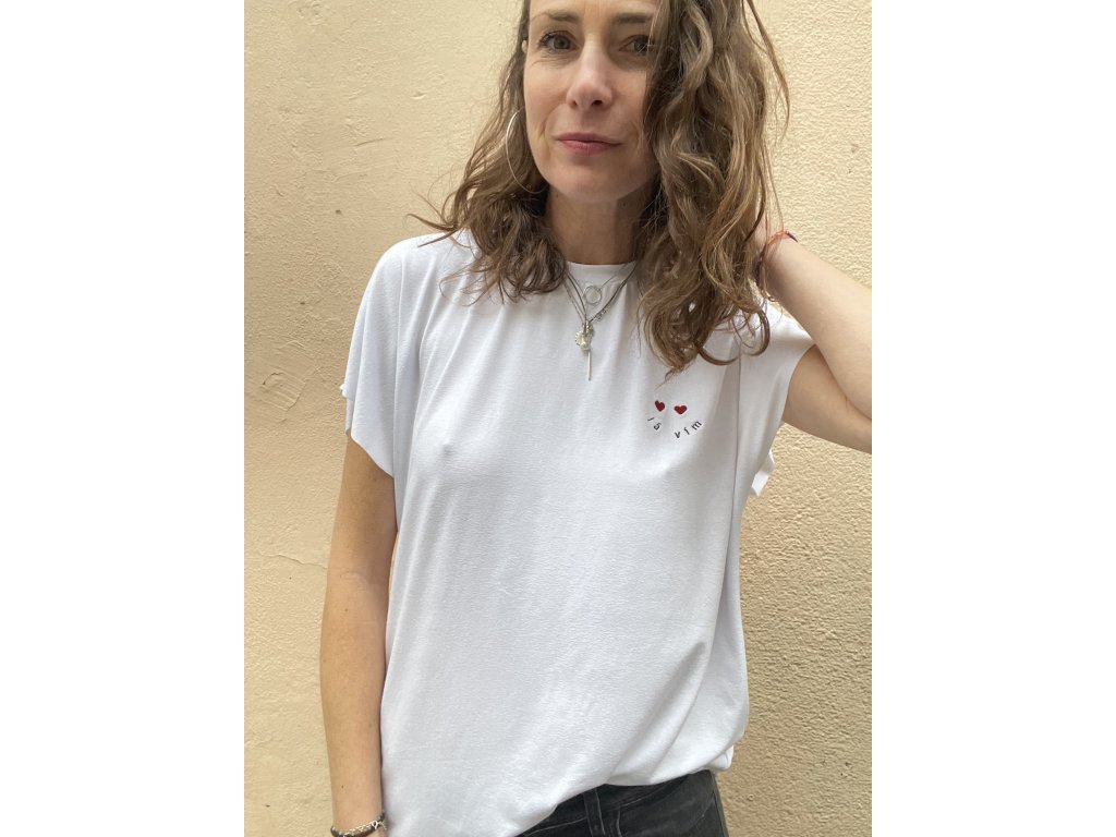 Triko je z pružné, bílé viskozy.Má volný střih, přinechané nezačištěné rukávky.Nezačištěný spodní lem.Na prsu výšivka “ já vím “ a srdíčka, na zádech “ mám takovej feeling “ a srdce v tisku.
