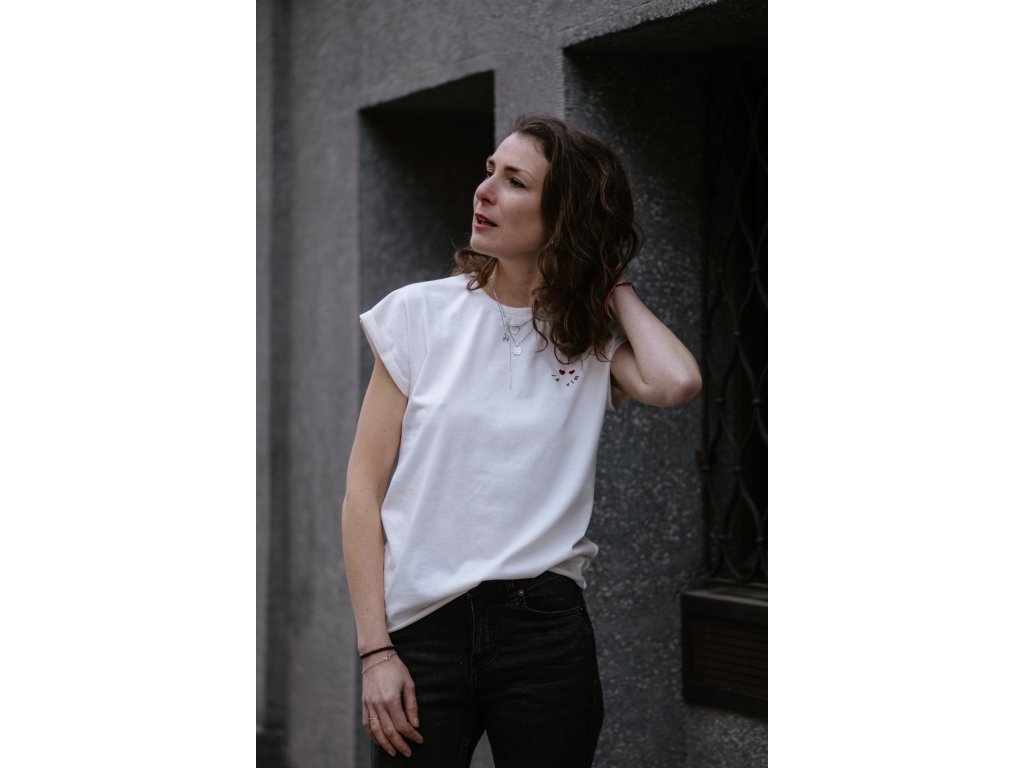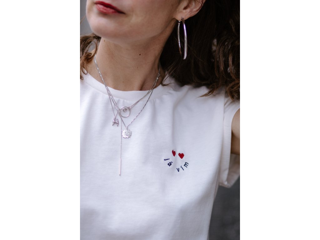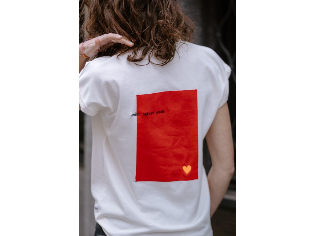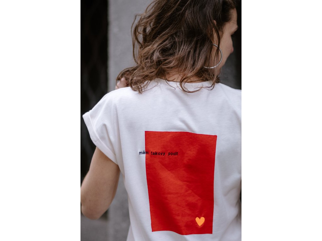 Triko je z krémové bavlny, má volný střih, přinechané ohrnuté rukávky, nezačištěný dolní kraj, na prsu vyšitý nápis “já vím “ a dvě srdce, na zadním díle v červeném obdelníku vyšito oranž srdce a nápis “ mám takovy pocit “