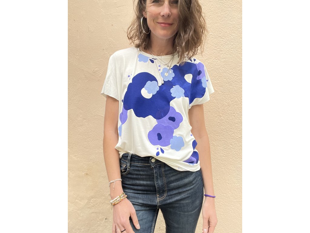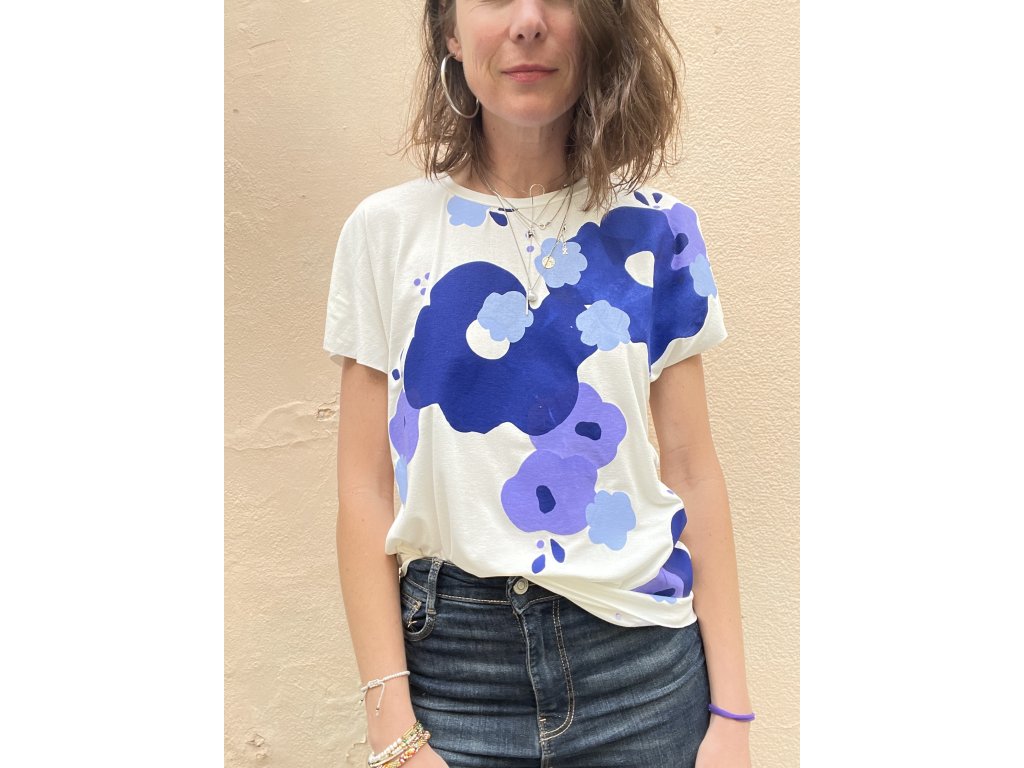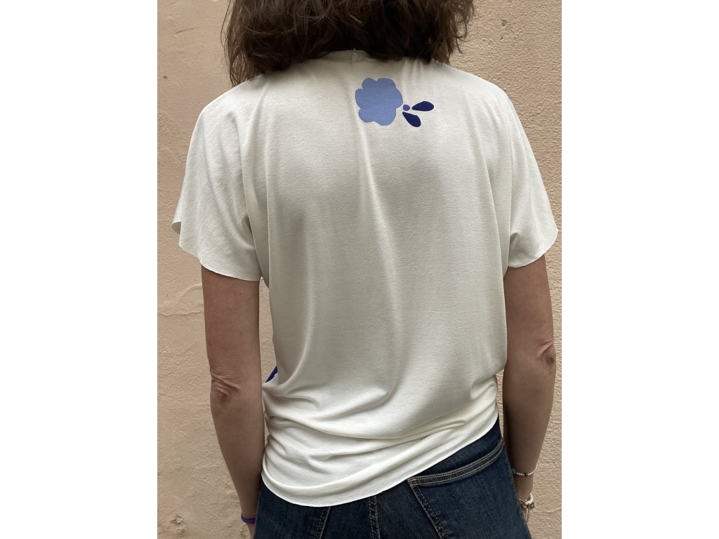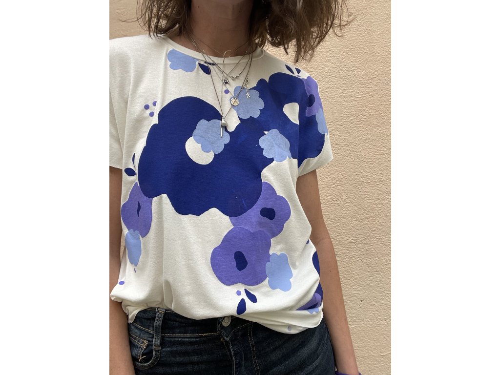 Tričko je z jemného úpletu, má volný netopýří střih, nezačištěné průramky a dolní kraj. Modro/fialový potisk.