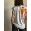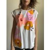 Tričko je z pružného bílého úpletu, má volný střih, ohrnuté a prošité rukávky, nezačištěný dolní kraj.