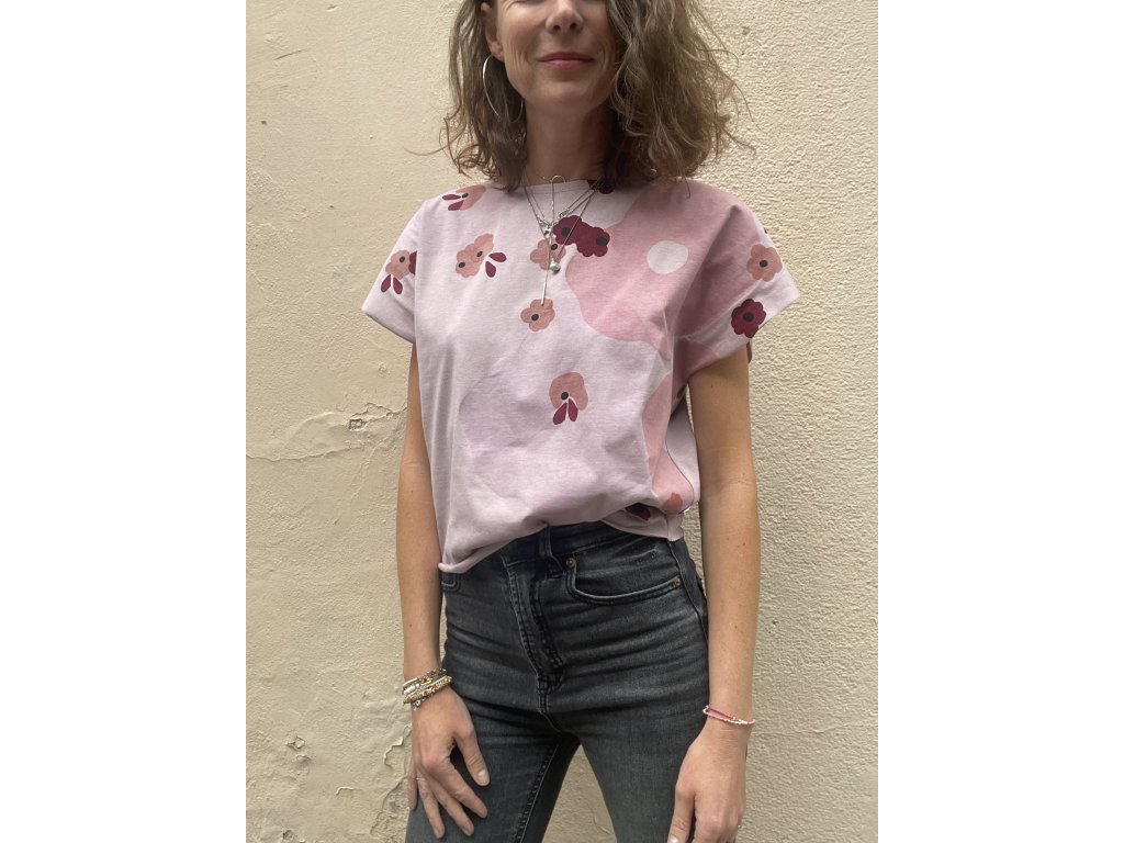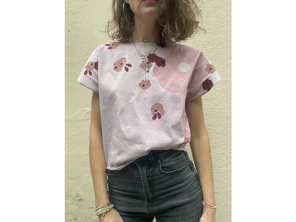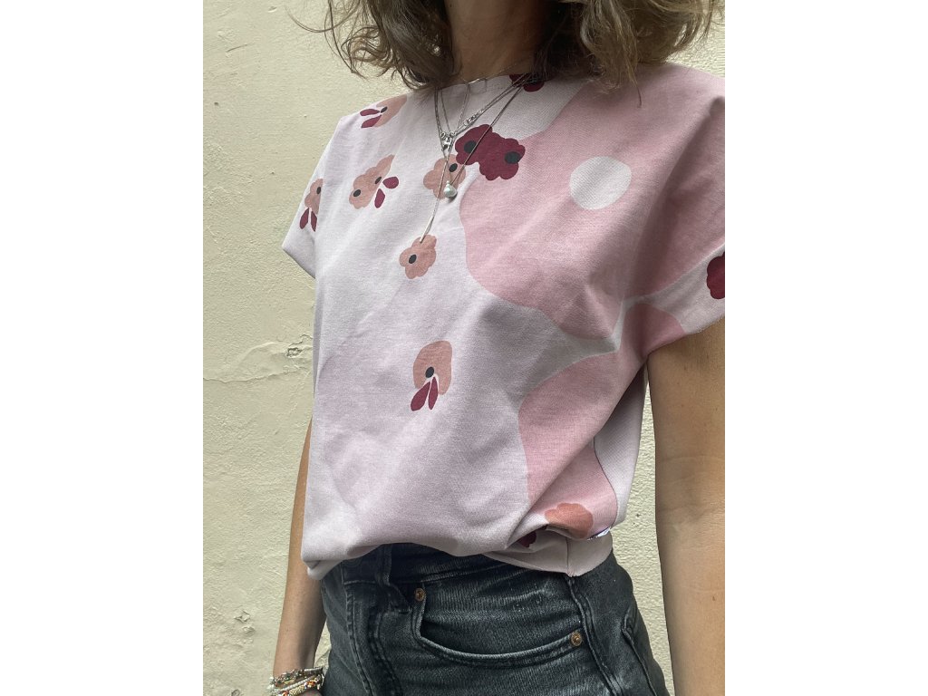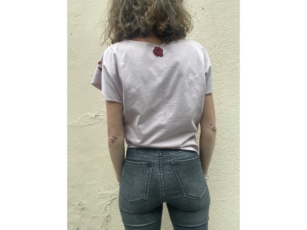 Triko je z lila/růžové bavlny, má volný a kratší střih, lodičkový výstřih, nezačištěné průramky a dolní kraj…
