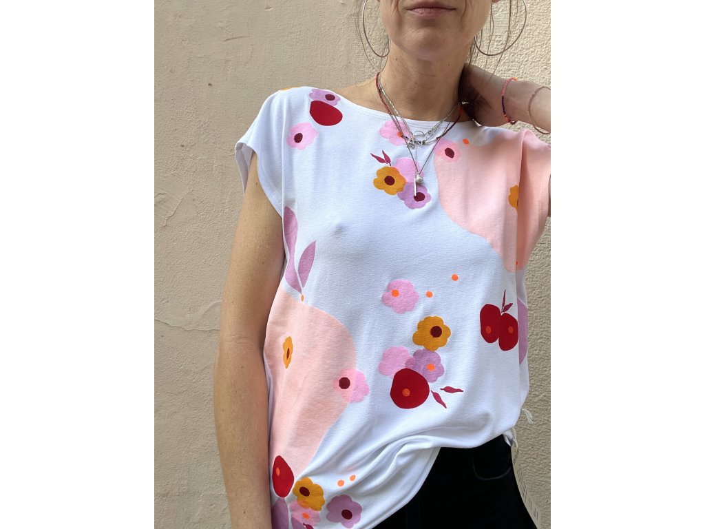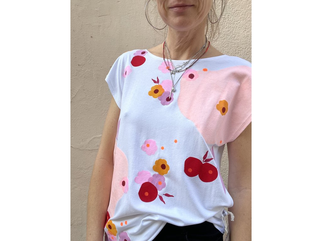 Triko je z pružné viskozy, má volný střih, lodičkový výstřih, barevný květinový motiv, nezačištěné kraje..