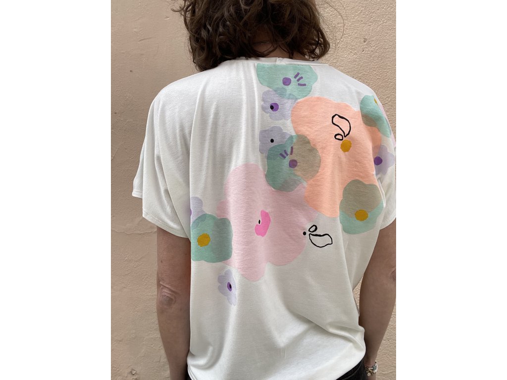 Triko je z jemného, pružného bílého úpletu, má netopýří střih, barevný jemný tisk, nezačištěný spodní kraj.