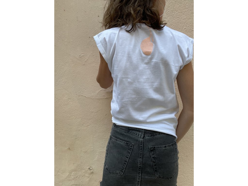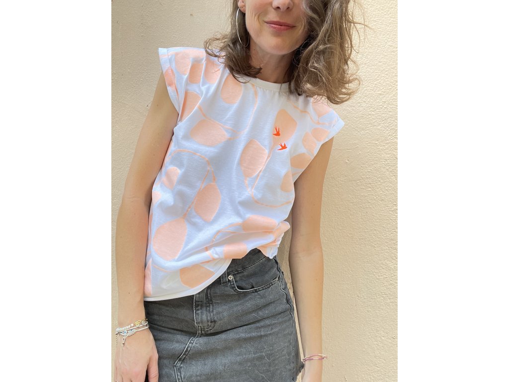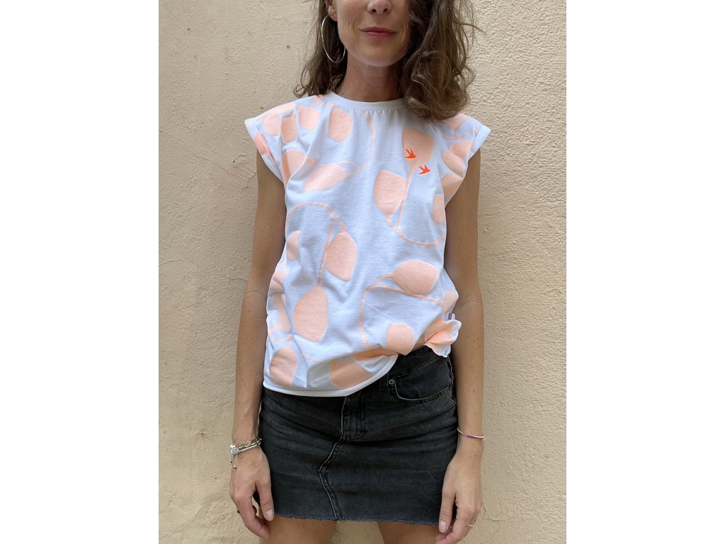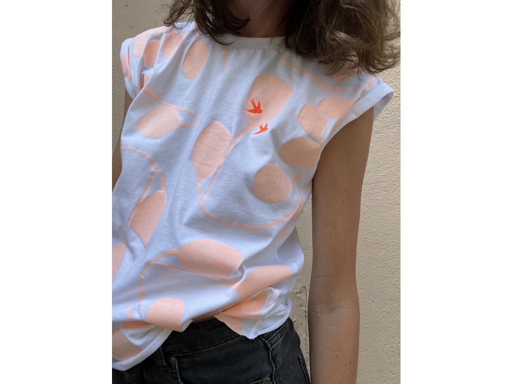 Triko je z bílé tenčí bavlny, má meruňkový potisk, oranžovou výšivku na předním díle, volnější střih s ohrnutými a bodově přišitými rukávky…nezačištěný dolní kraj