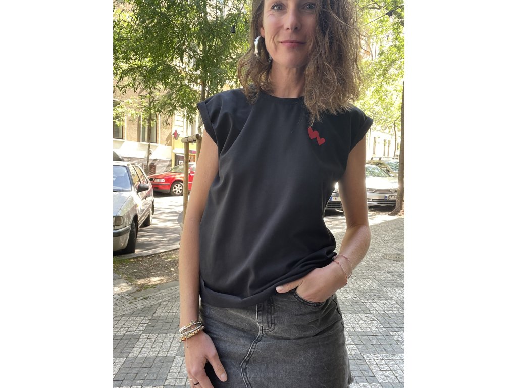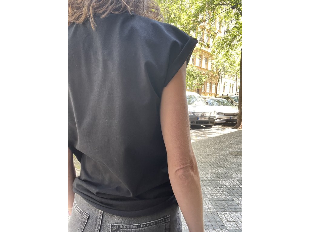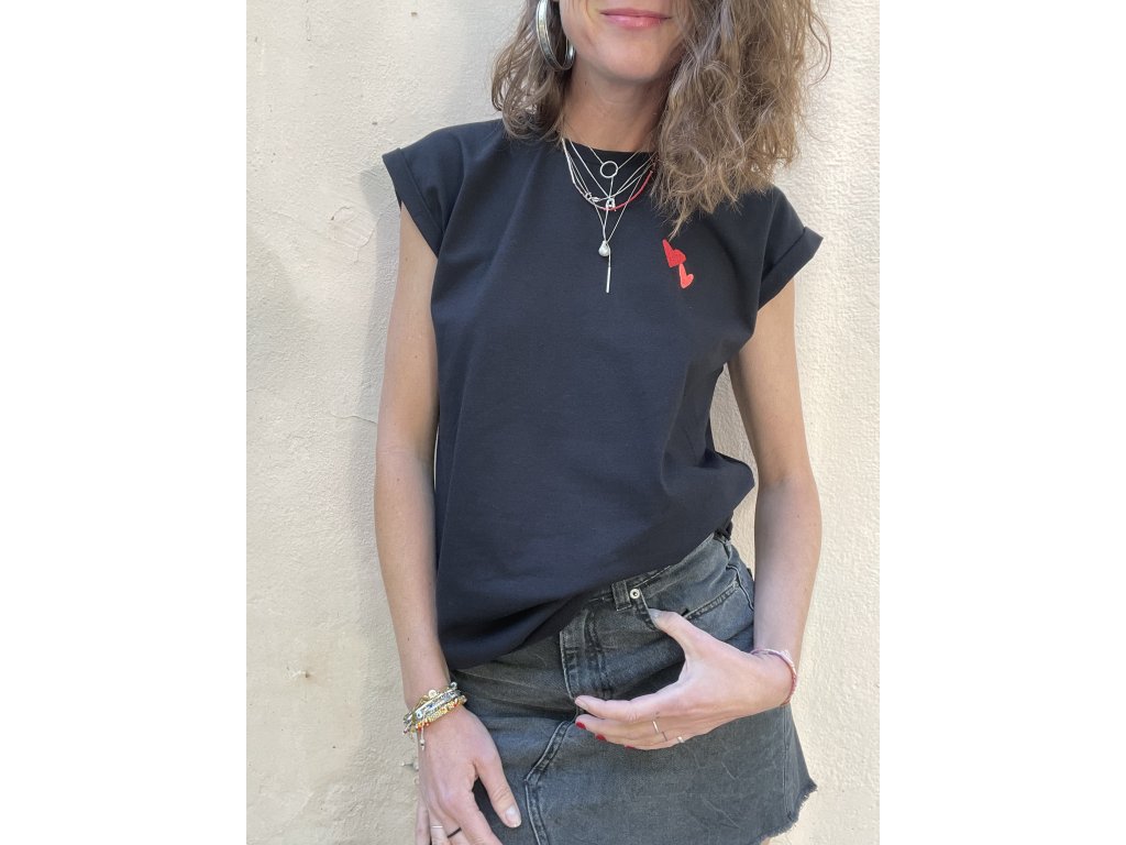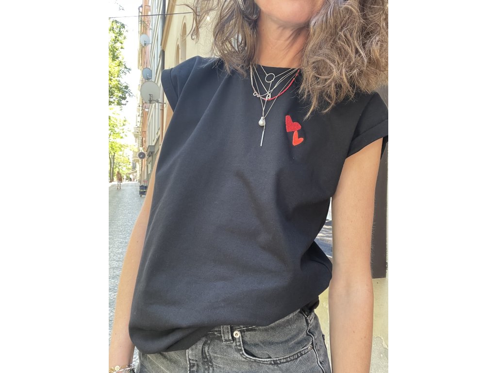 Triko je z černé pružné bavlny, má vyšitá 2 srdíčka - červené a růžové - Volnější střih, ohrnuté a bodově prošité rukávky, nezačištěný dolní kraj