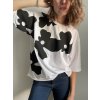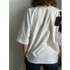 Triko je z pružné bílé bavlny, má volný oversize střih, černý potisk a nezačištěný dolní kraj.