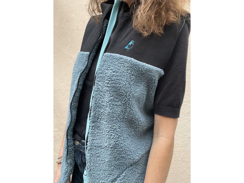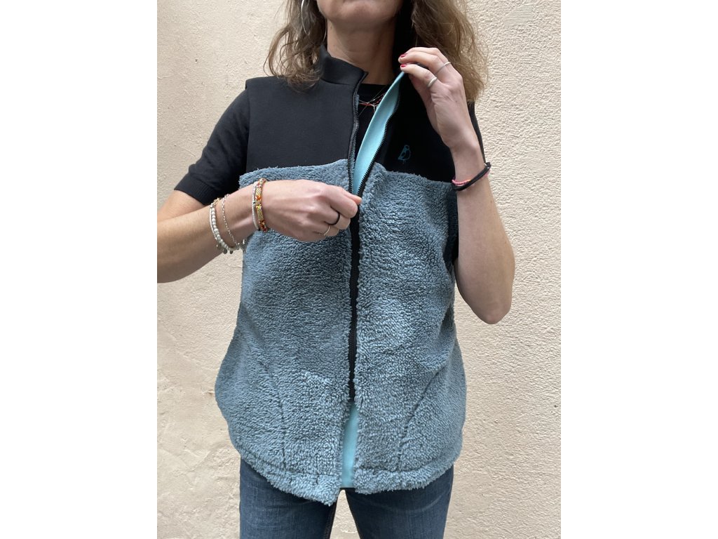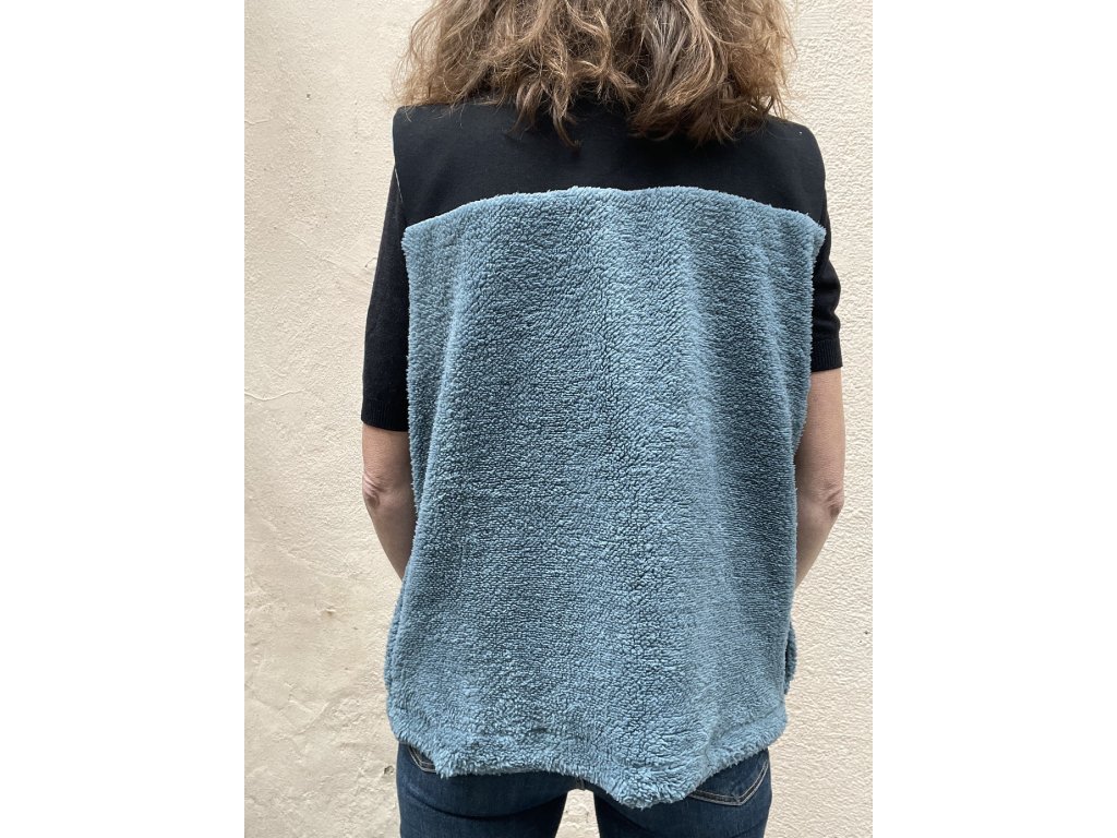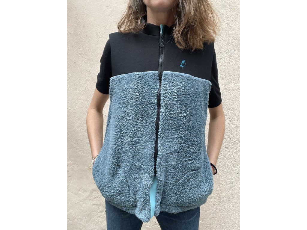 Vesta má jednu část z petrolejově modrého kožíšku, vrchní díly z černé teplákoviny, modrá výšivka, vypodšívkovaná, modrá patka.Kapsy v bocích