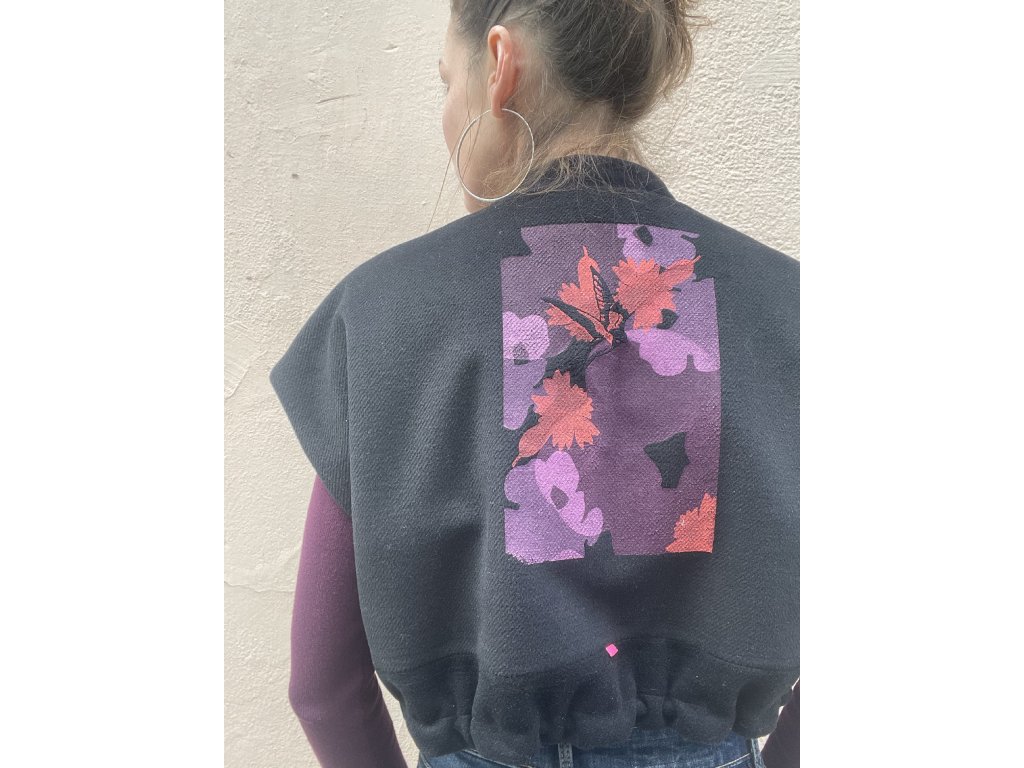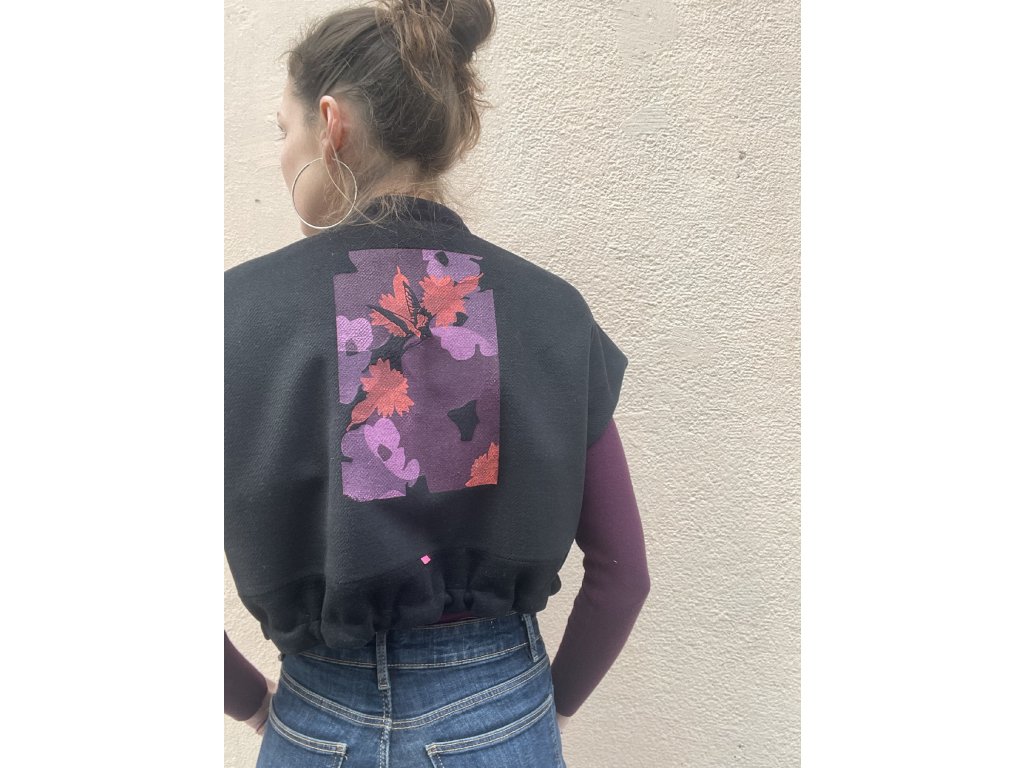 Černá vesta je ze “ semišové “ látky, má volný střih stažený pod prsy gumou a brzdou, růžový teplákový rub, lišta a zapínání na zip.