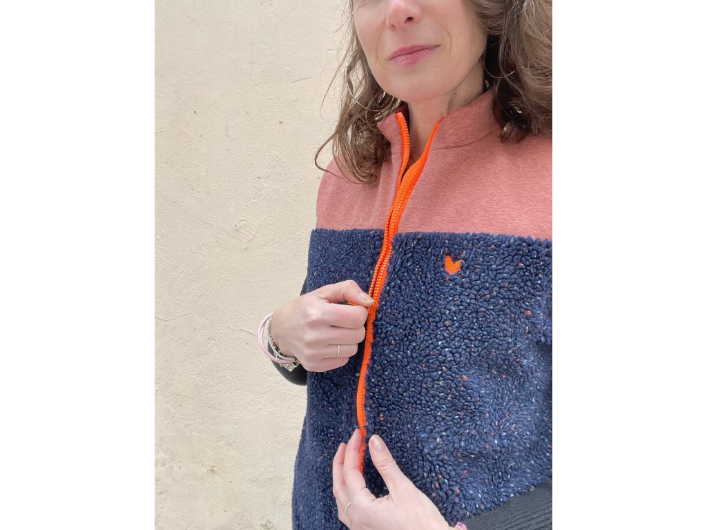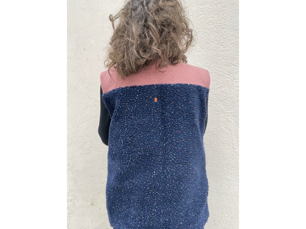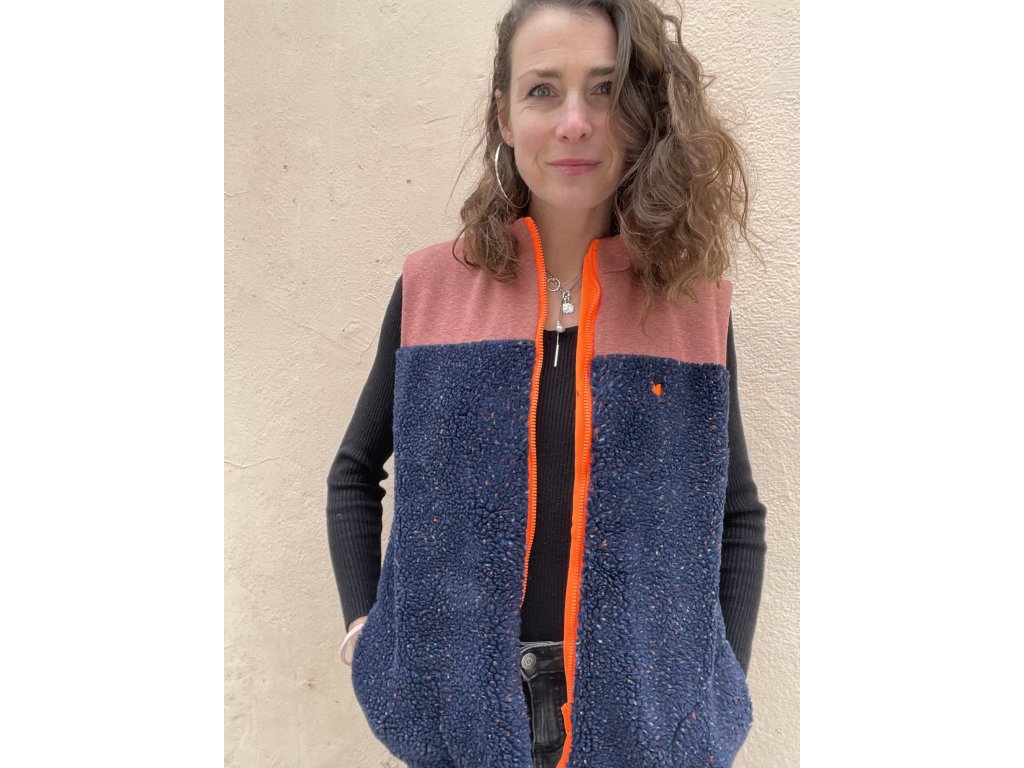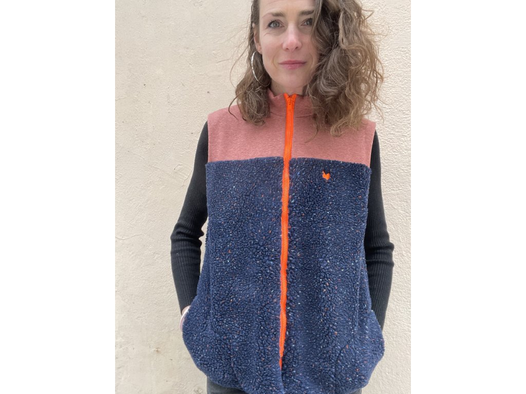 Vesta má část z cihlové teplákoviny a část z modrého beránka.Kapsy v bocích, zip do stojáčku, oranž patka a výšivka.