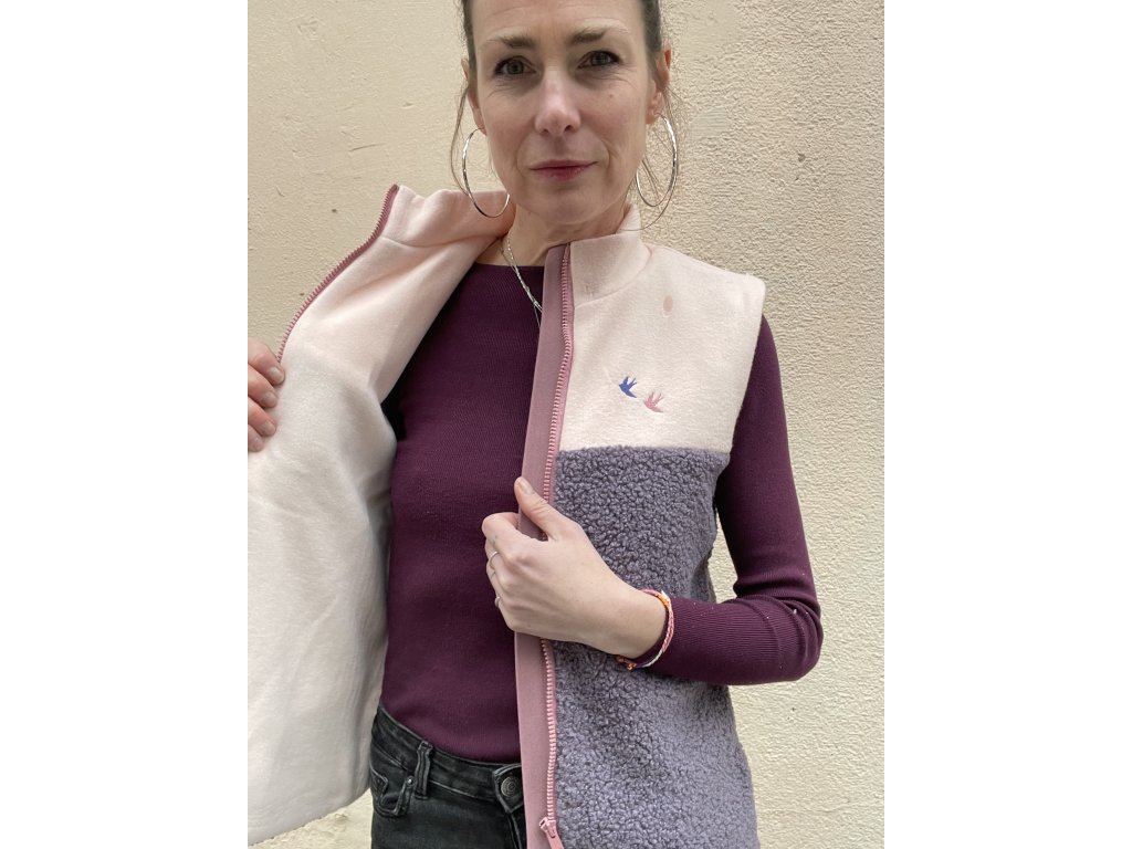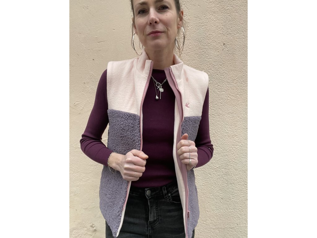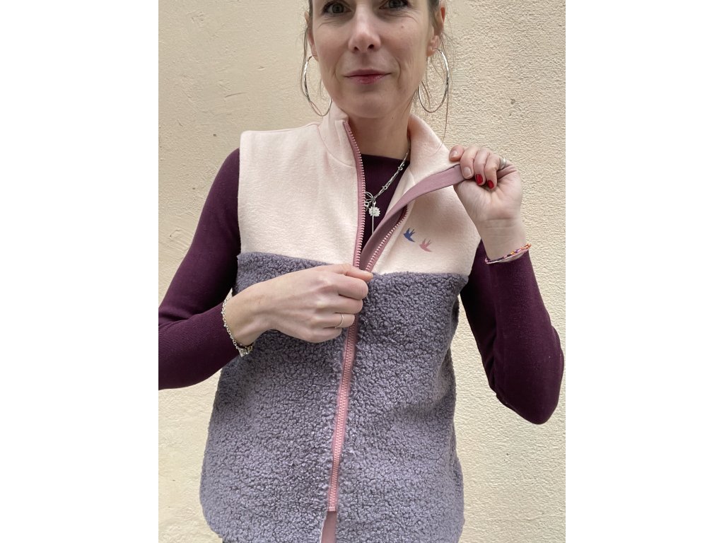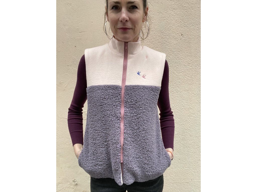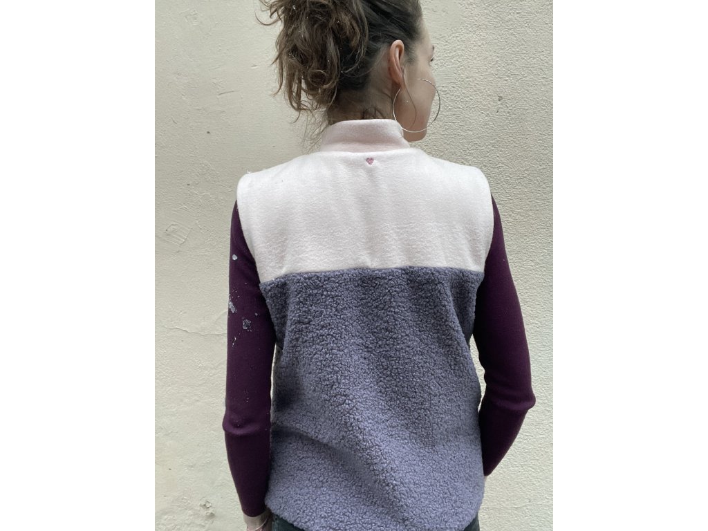 Vesta má vrchní část a vnitřní z meruňkového jemného fleecu, spodní část z fialkové chlupaté látky, kapsy v bocích.