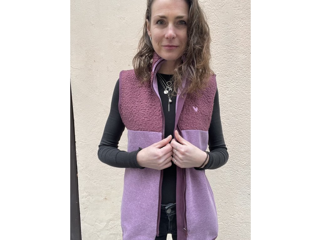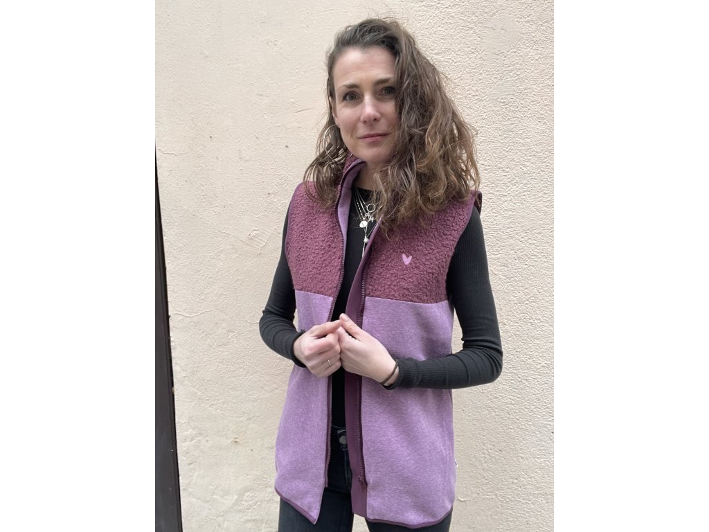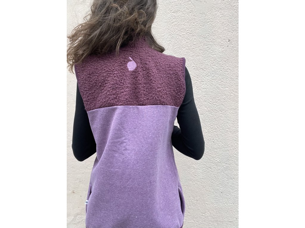 Vesta je z chlupaté vínové látky, část z fialkové teplákoviny, kapsy v bocích, těsnější stojáček, vínový zip, vínové lemování