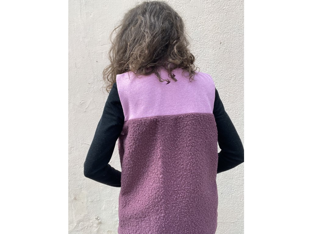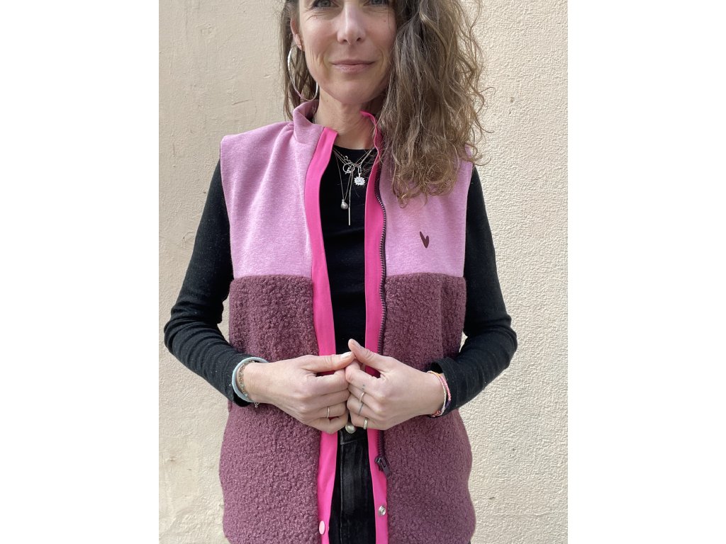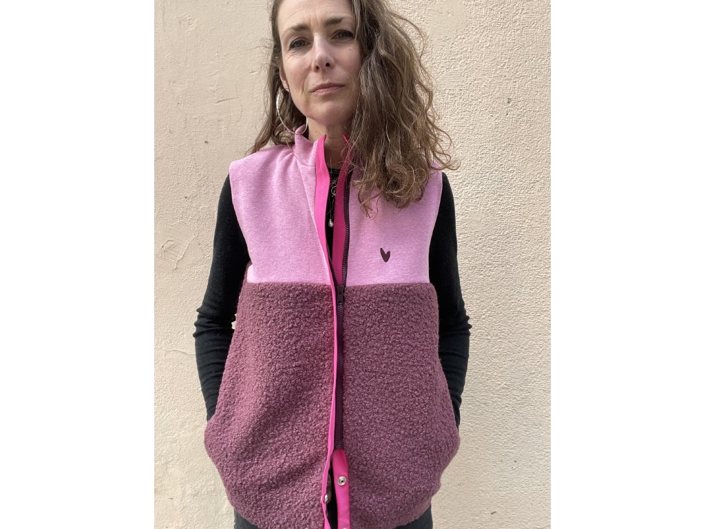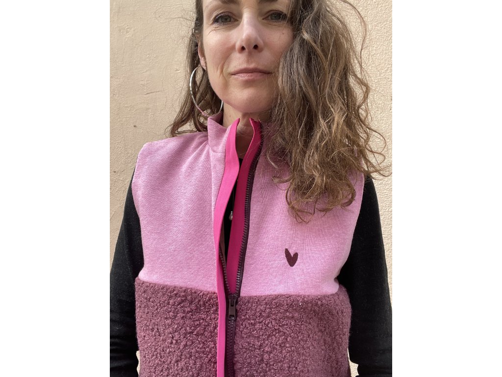 Vesta má horní část z melírované teplákoviny a spodní z bordo chlupaté látky, výrazná růžová lišta s dvěma růžovými patentkami a zipem, kapsy v bocích, podšívka v rubu.