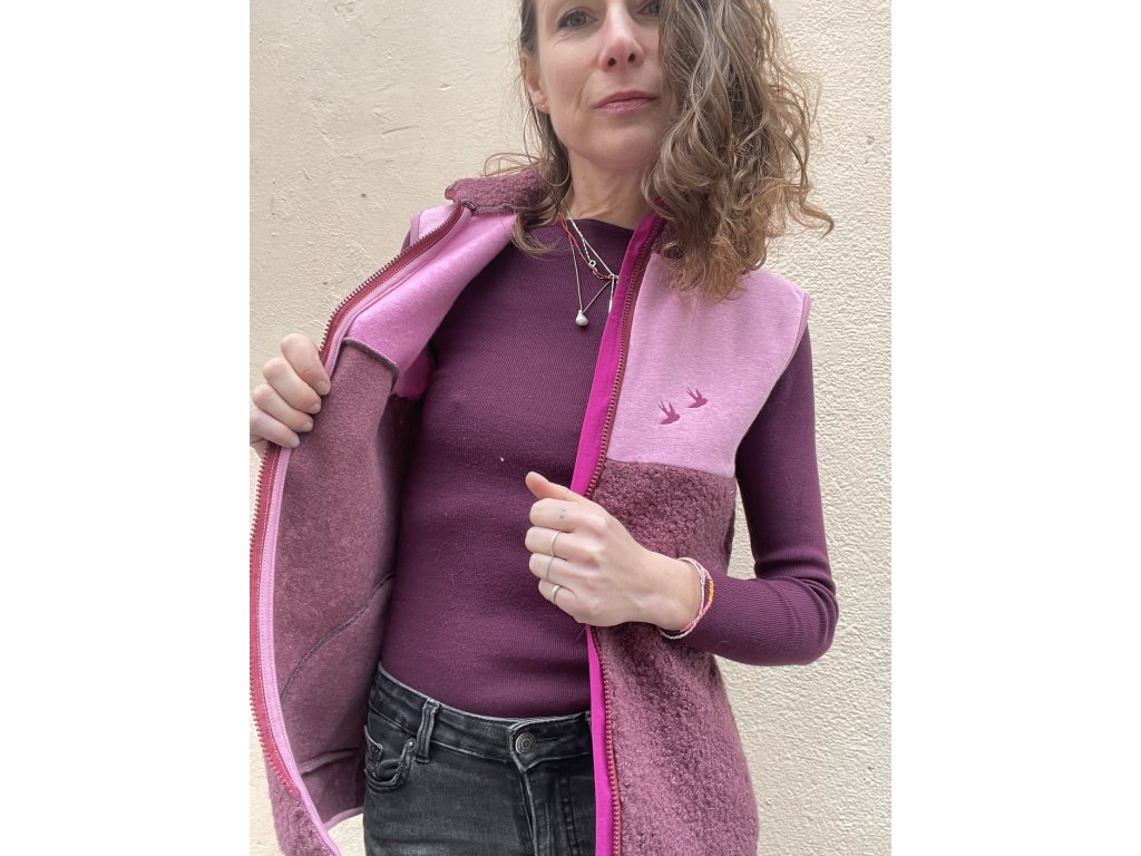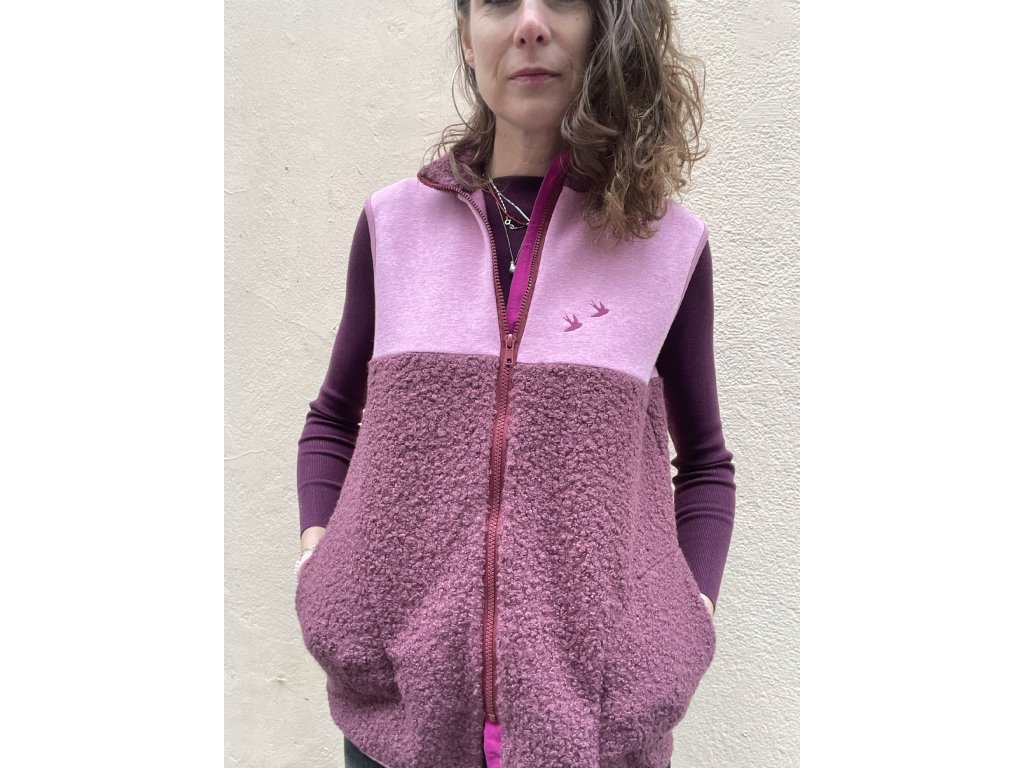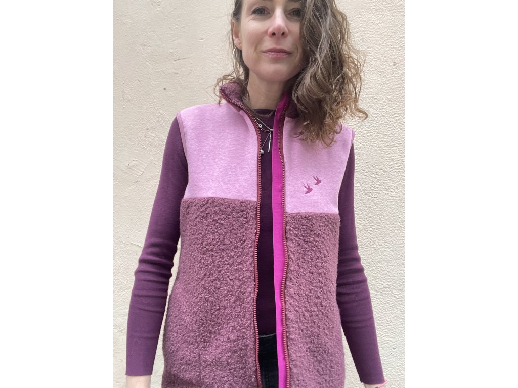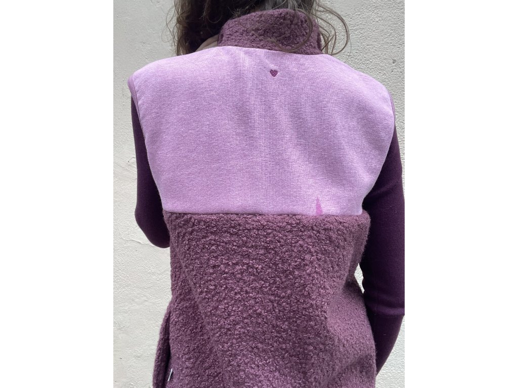 Vesta je z části ze zateplené teplákoviny a z části z hřejivého “beránka” , má fuksiovou výraznou patku, zip do stojáčku, kapsy v bocích, výšivka na prsu i zadním díle.Olemované průramky i dolní kraj.